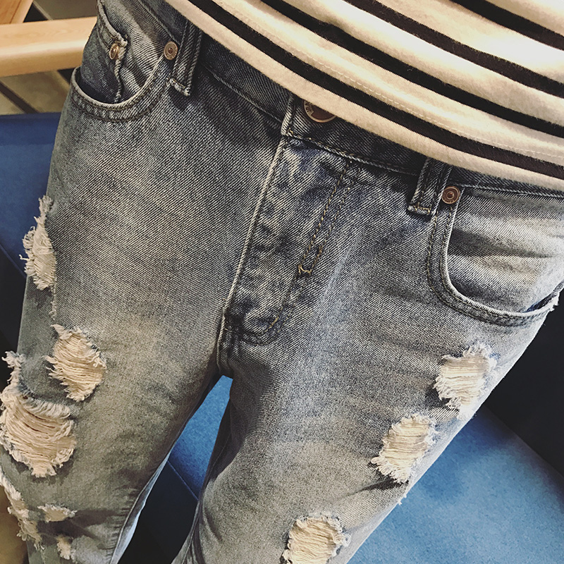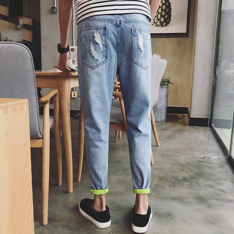 男裝韓版破洞牛仔九分褲男士修身小腳褲牛仔褲男褲