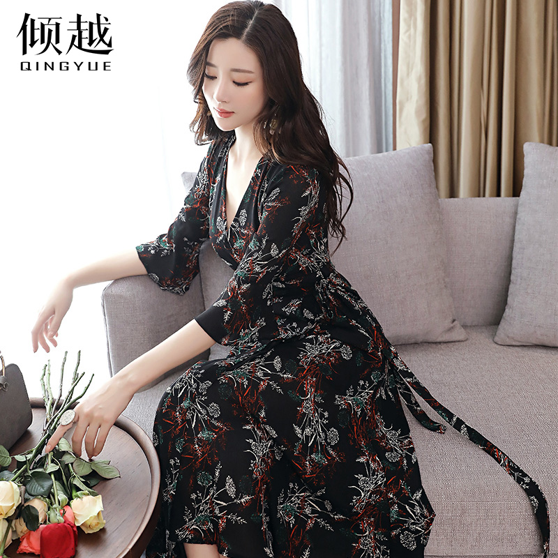 / 傾越春款連衣裙2017新款女夏季韓版七分袖V領中長雪紡印花A型裙子