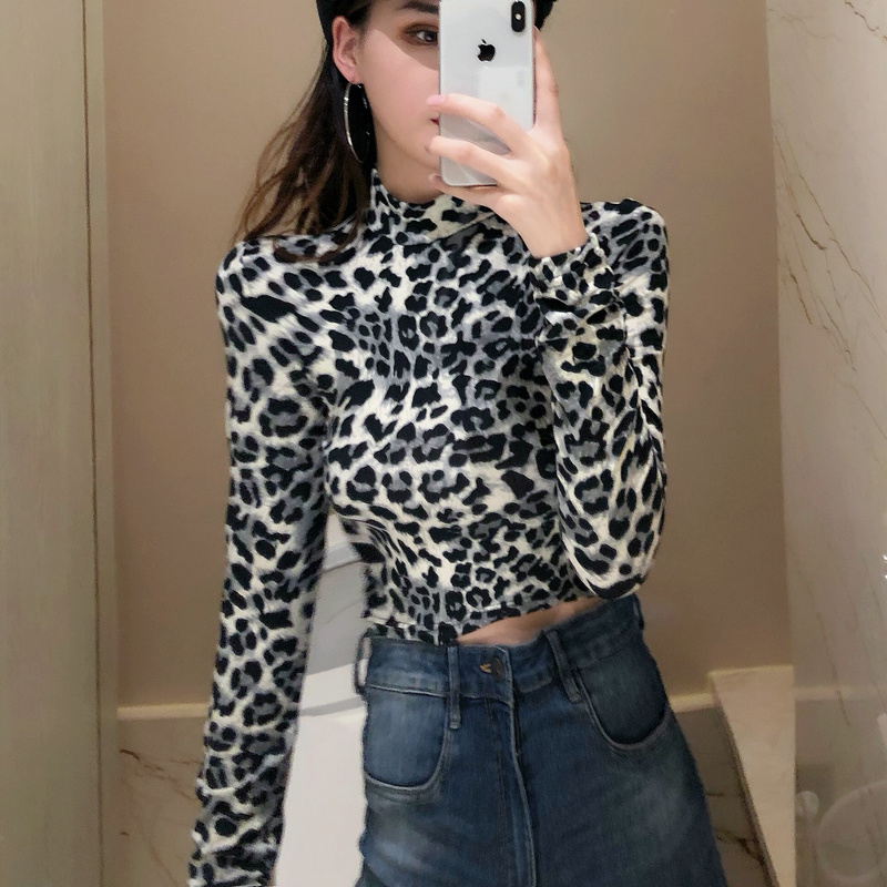 2018新款chic韓國港風小高領時尚豹紋短款長袖T恤修身潮流上衣女