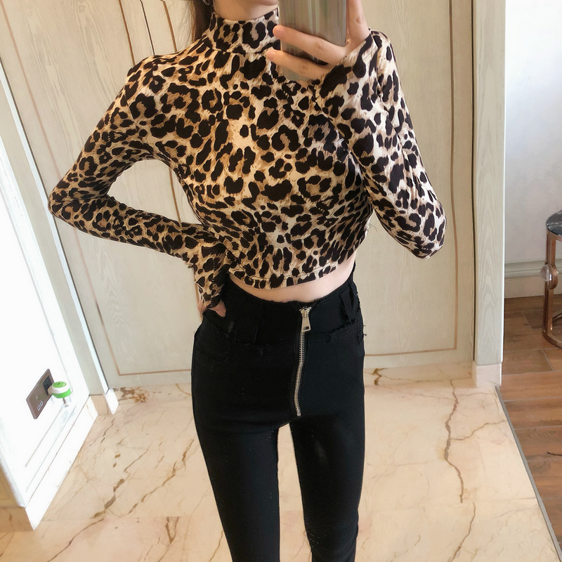 / 2018新款chic韓國港風小高領時尚豹紋短款長袖T恤修身潮流上衣女