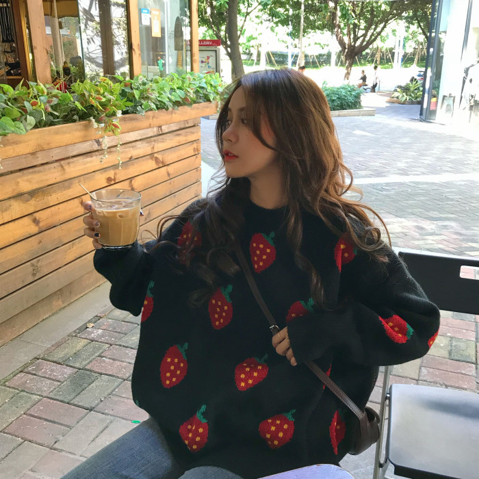 / 中長款新款秋冬季chic復古上衣草莓提花寬松圓領加厚保暖套頭毛衣