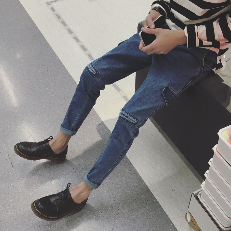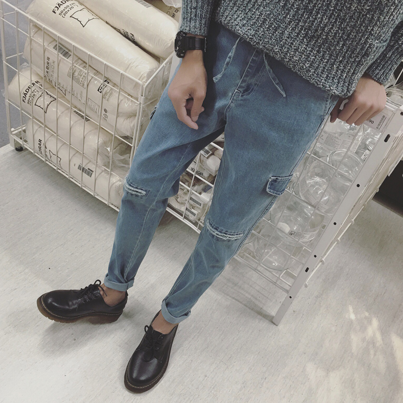 / 秋季新款韓版口袋破洞修身水洗小褲腳男士牛仔褲