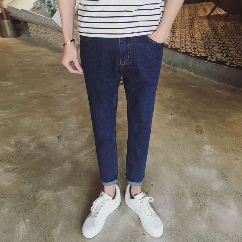 原創經典百搭韓版修身小腳男士淺色九分錐形牛仔褲