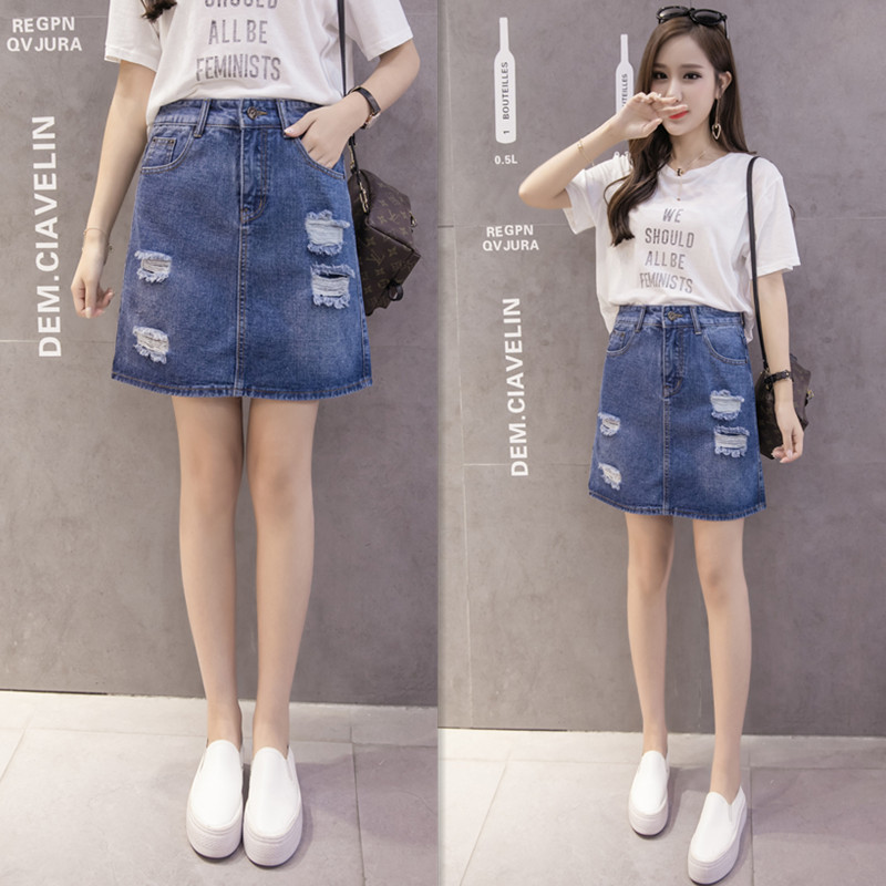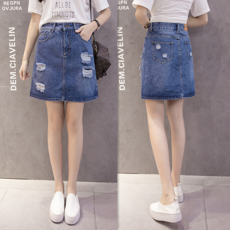 / 夏季韓版高腰破洞牛仔裙半身裙女磨破A字包臀短裙防走光褲裙半裙