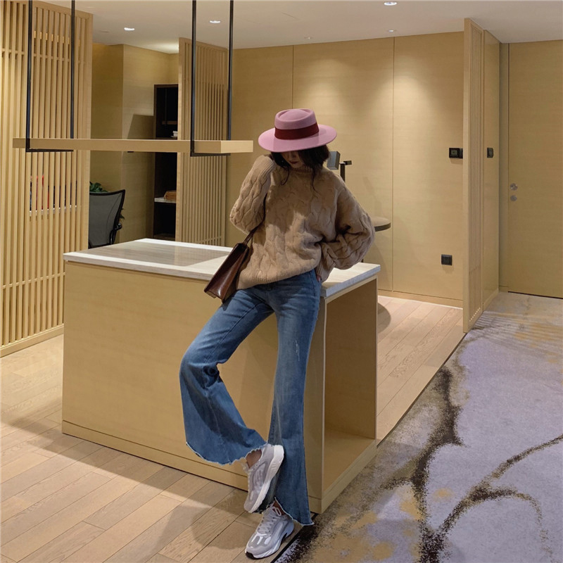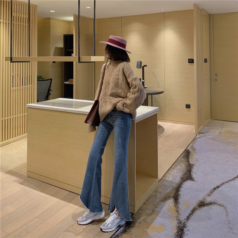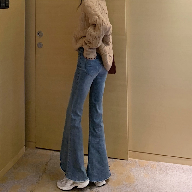 褲子女新款韓版chic時尚復古氣質喇叭褲高腰顯瘦不規則牛仔長褲潮