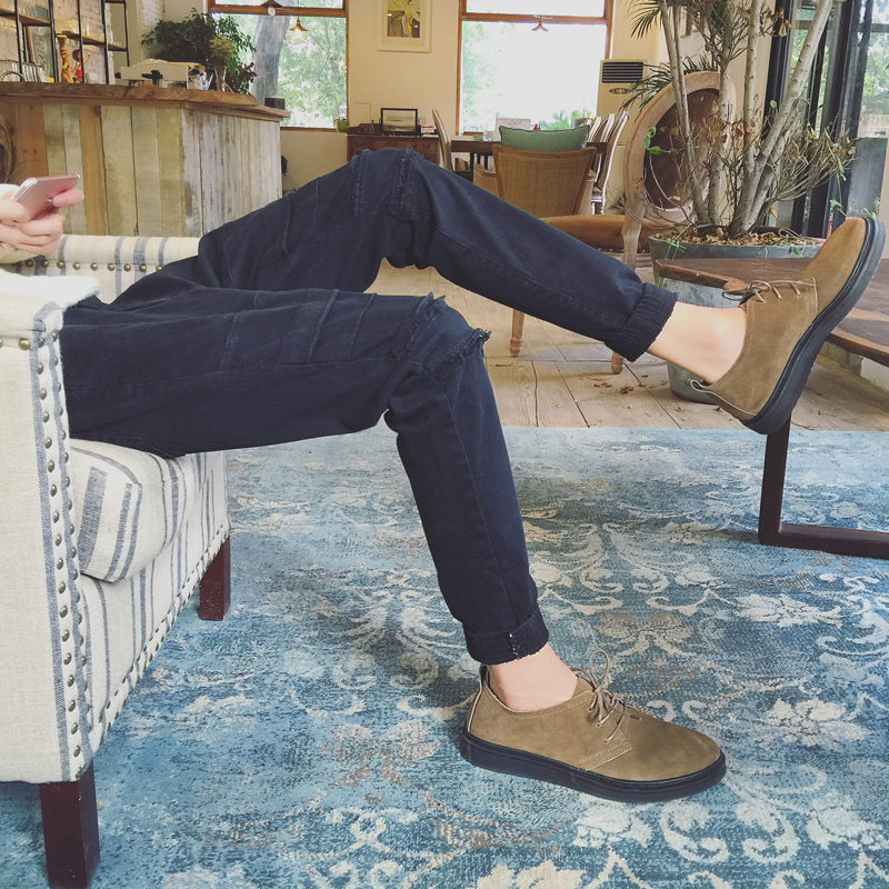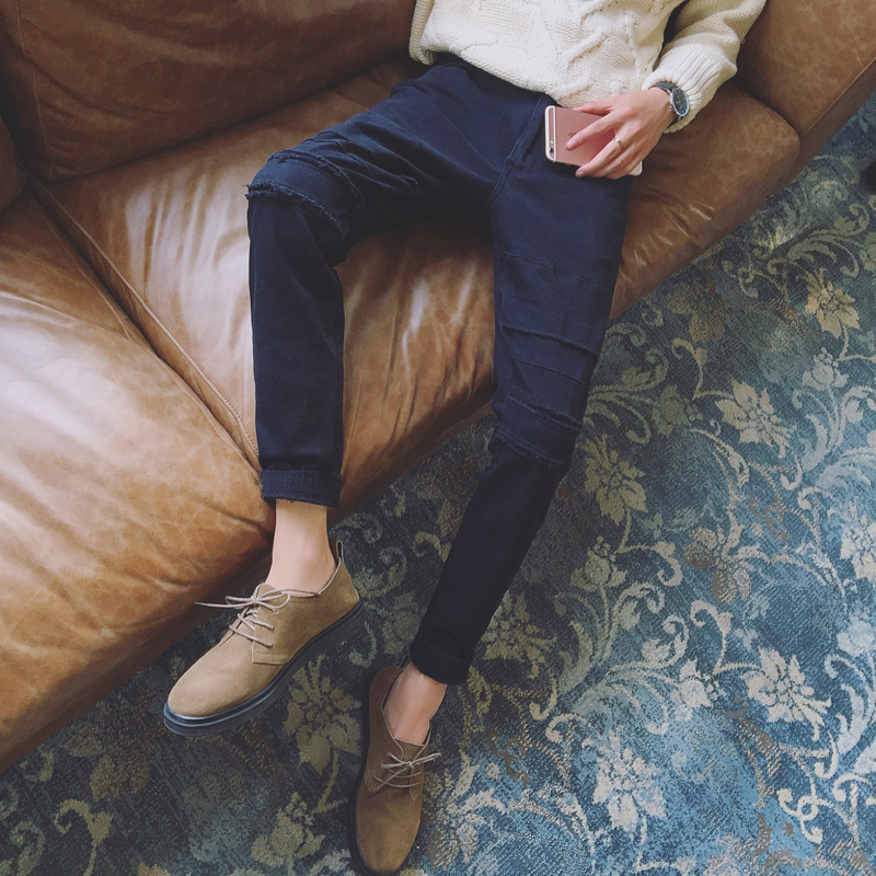 / 新款韓版修身褶皺膝蓋休閑褲束腳褲男士修身小腳褲
