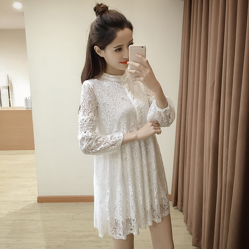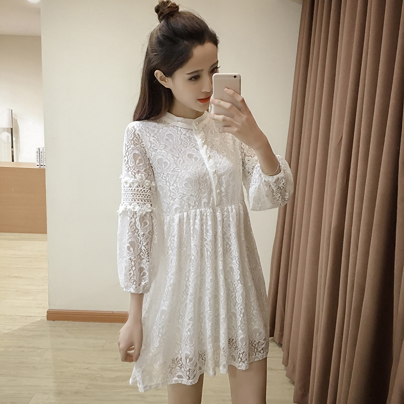 / 春裝新款女裝中長款燈籠袖打底裙寬松顯瘦鏤空蕾絲連衣裙春秋