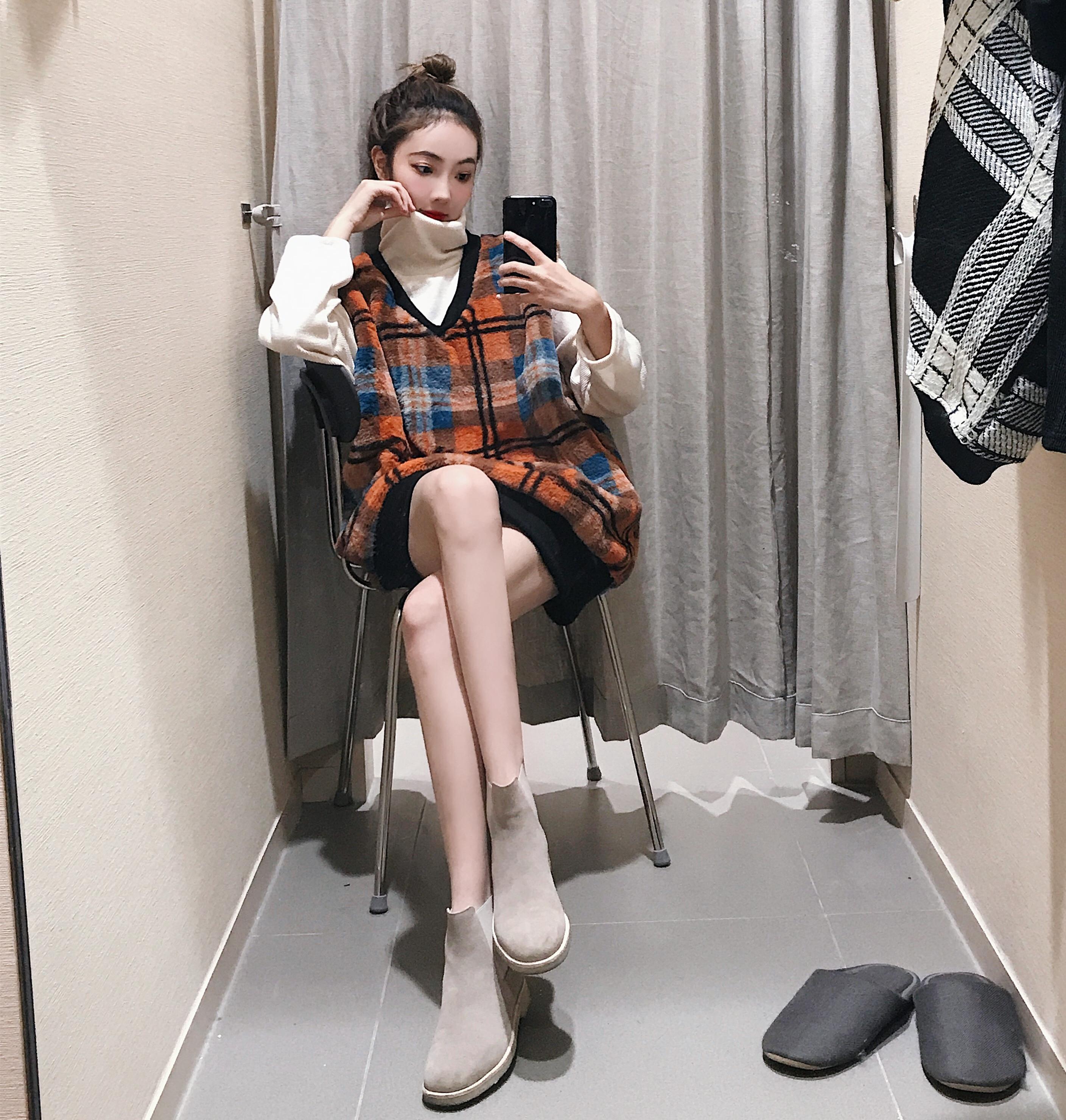 港風時尚套裝新款復古格子毛絨厚背心馬甲高領中長款打底衫兩件套