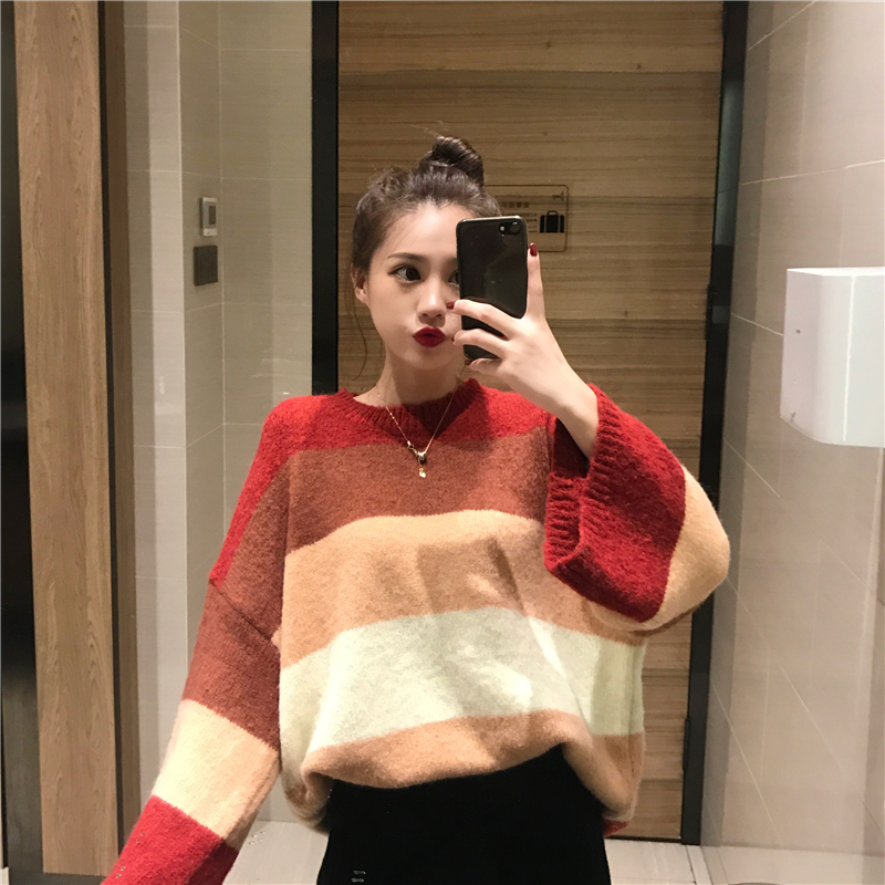 新款寬松慵懶溫柔拼色條紋毛衣時尚套裝開叉包臀裙半身裙兩件套女