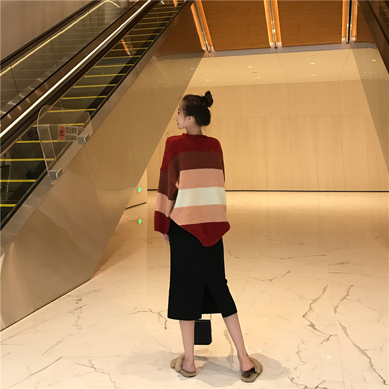 / 新款寬松慵懶溫柔拼色條紋毛衣時尚套裝開叉包臀裙半身裙兩件套女