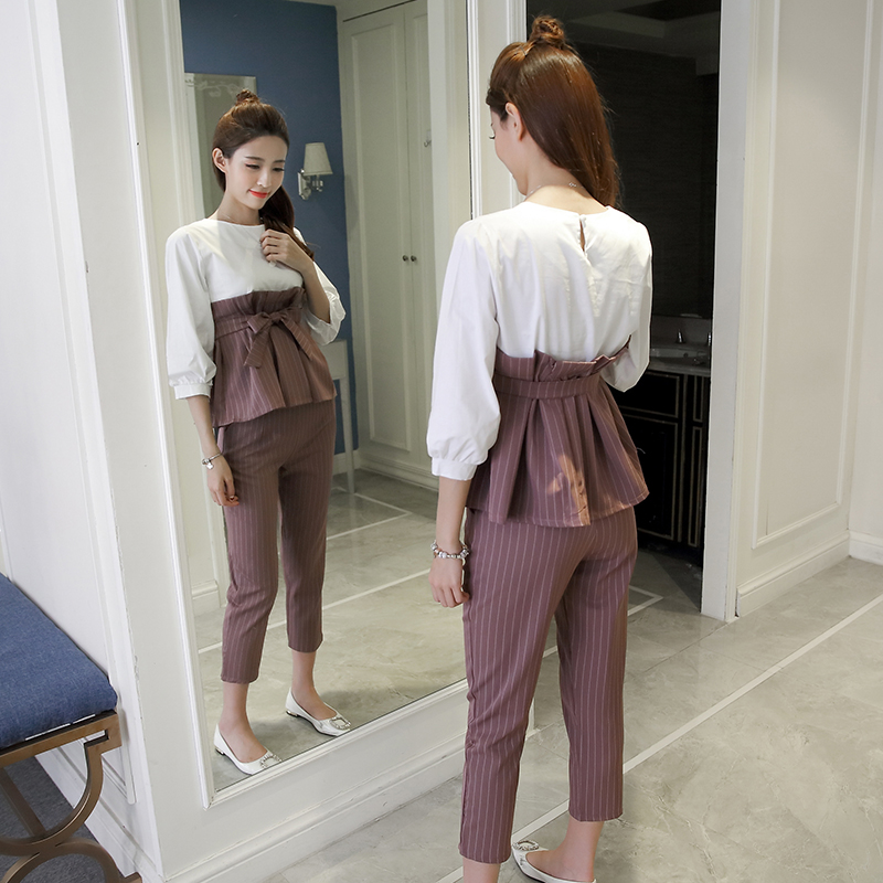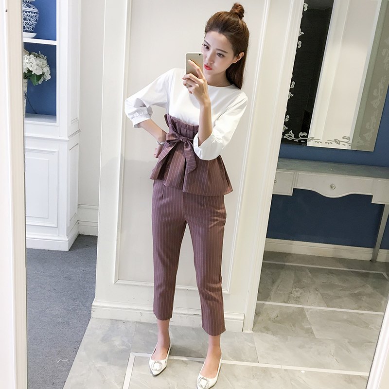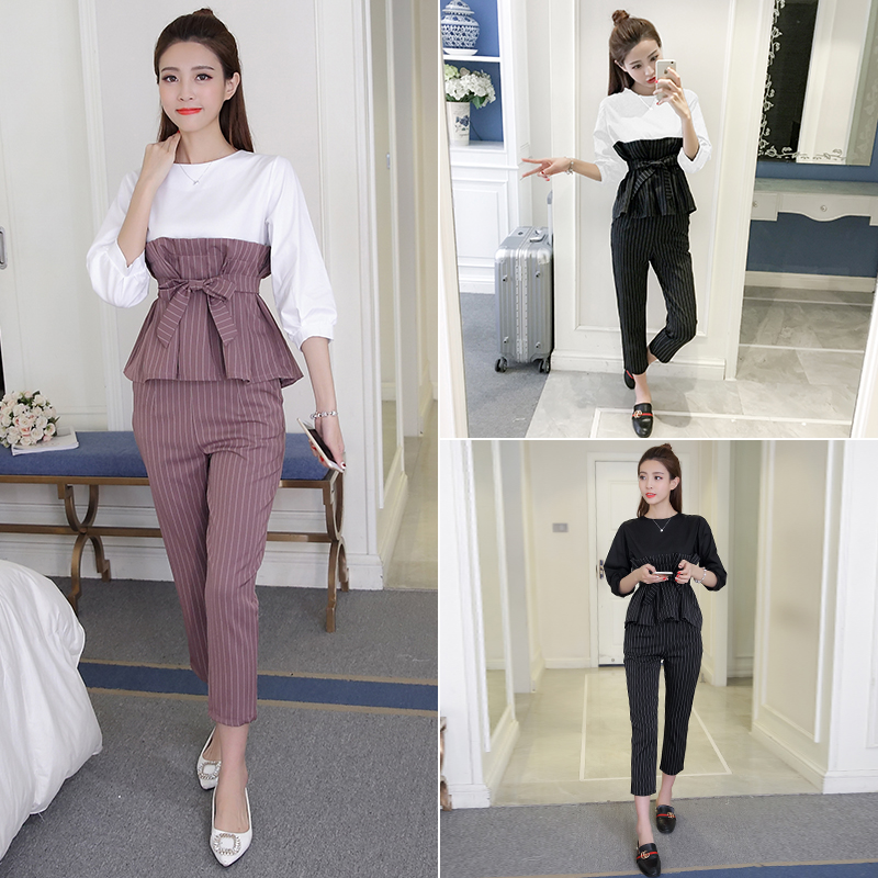 / 春夏新款名媛氣質七分袖上衣兩件套女韓版休閑九分褲條紋套裝