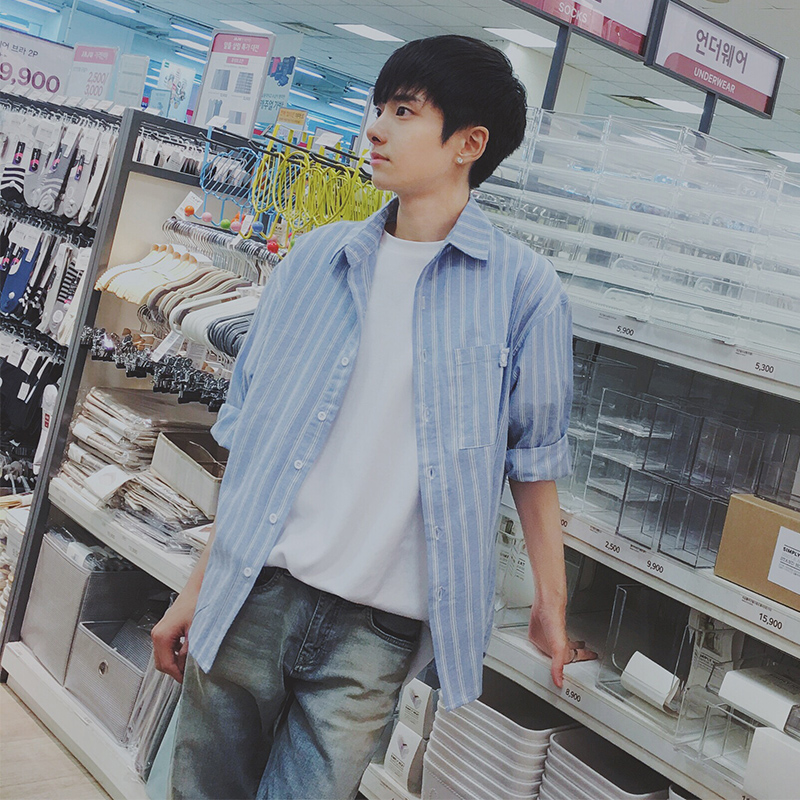 / 新品韓版男士個性口袋七分袖襯衣男士條紋襯衫