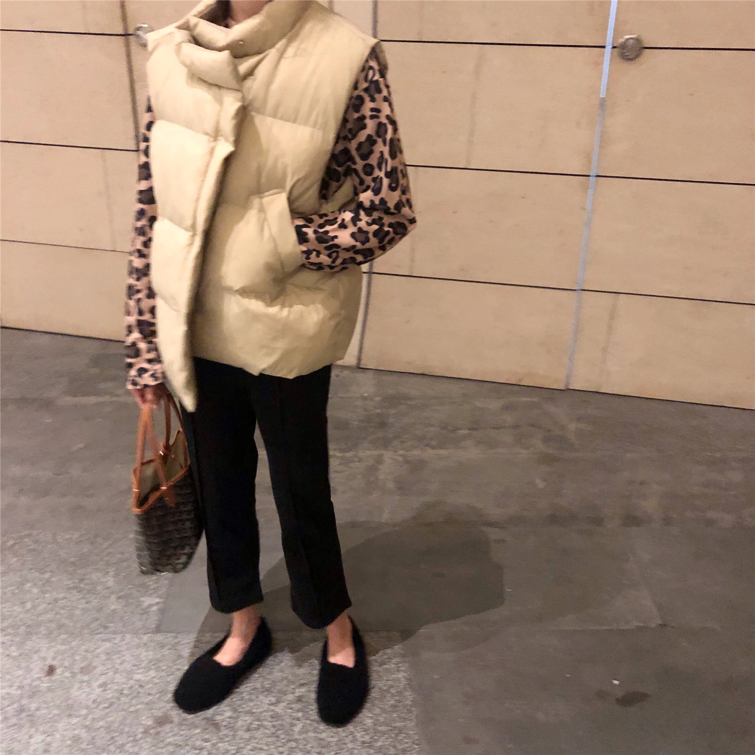 呢子拼接褲|豹紋內搭|咖色面包背心|米色面包背心