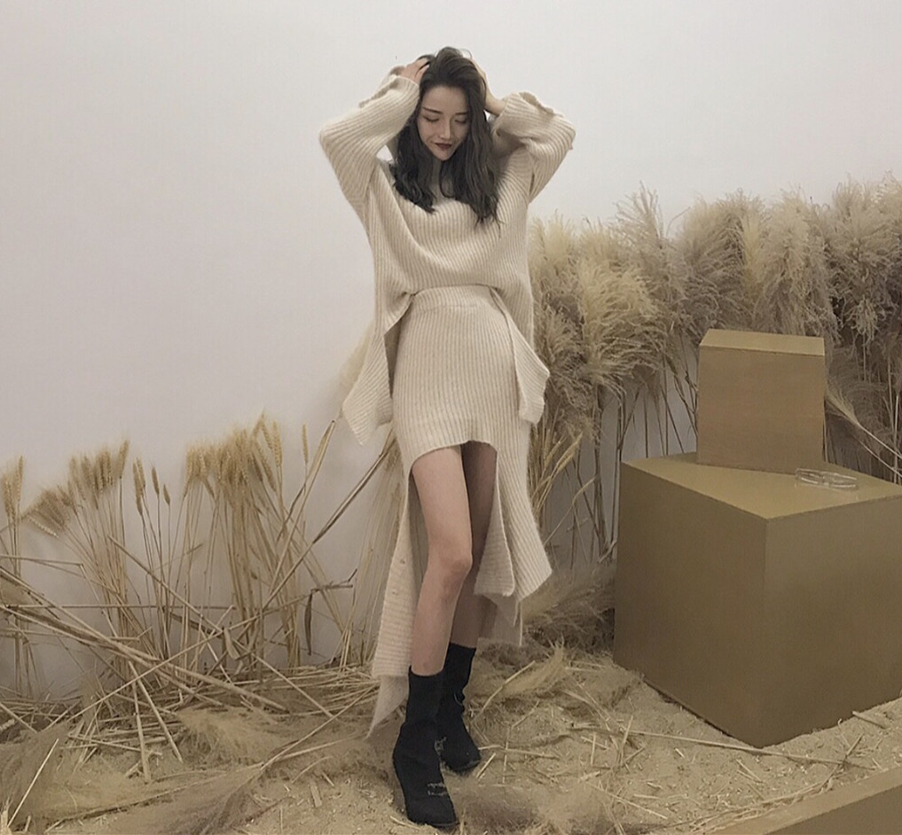 / 秋裝新款不規則套頭上衣高腰半身裙針織時尚設計感套裝兩件套女潮
