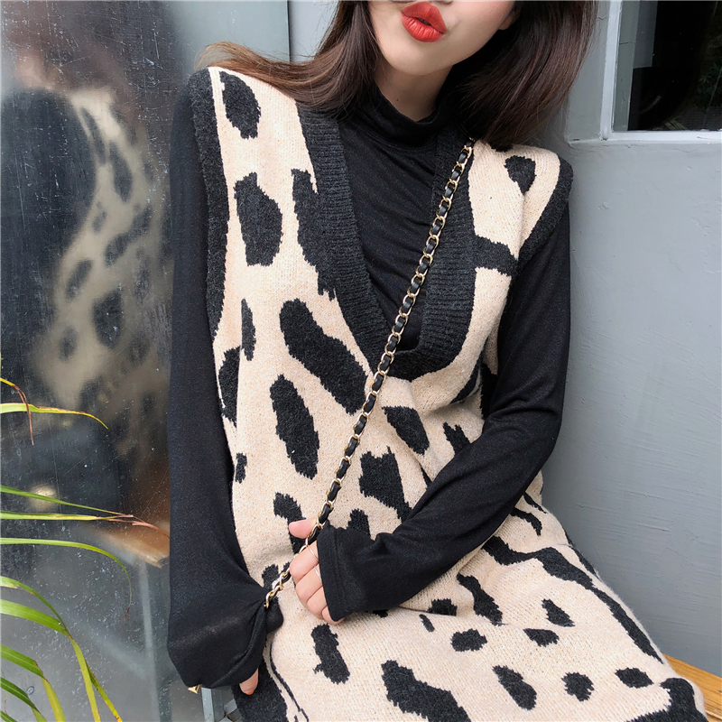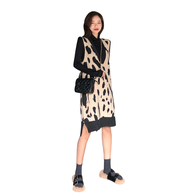 / 秋冬時尚女裝新款韓版chic慵懶風寬松百搭豹紋V領中長款針織馬甲