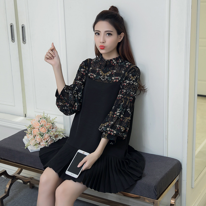 / 春秋裝新款女裝復古印花兩件套顯瘦百褶中長款吊帶碎花連衣裙