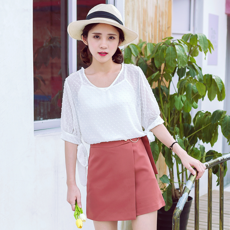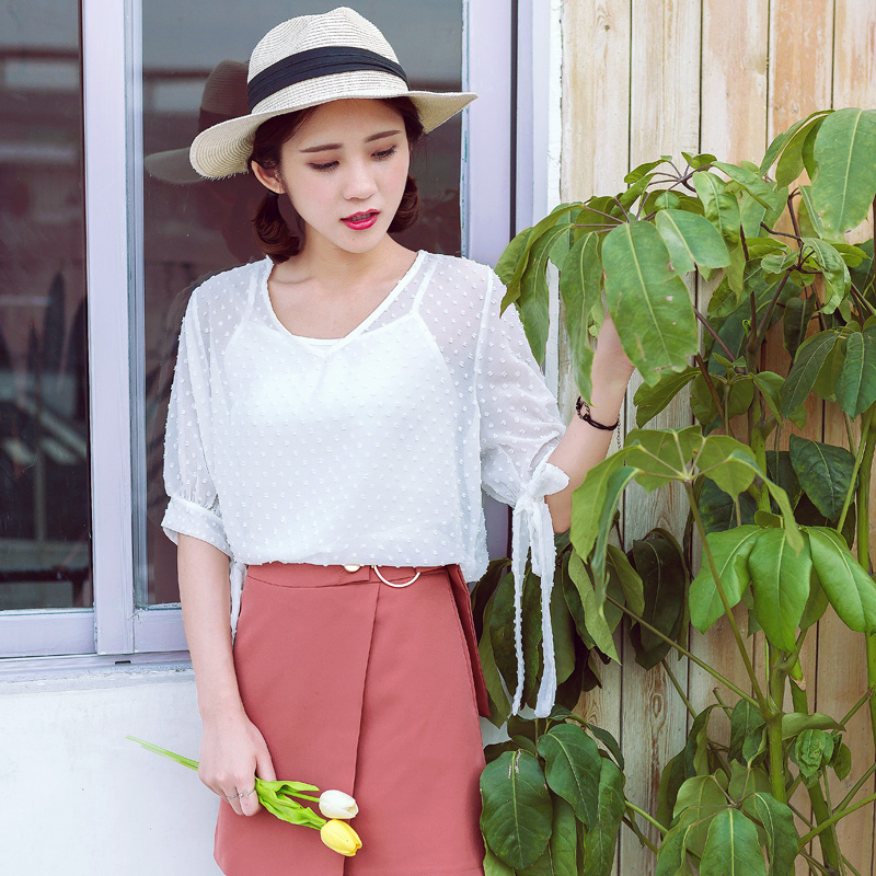 / V領短袖小吊帶兩件套雪紡衫女夏裝寬松中長款紗網罩衫套裝潮