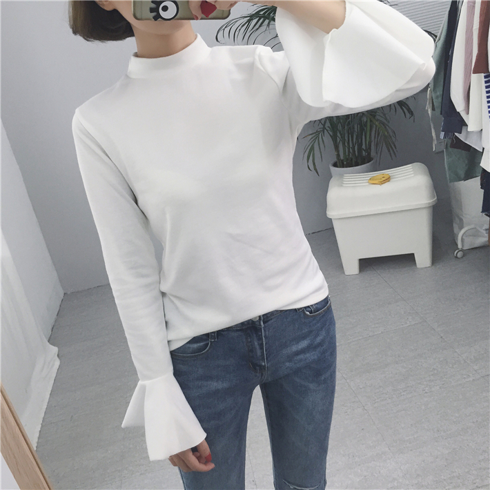 韓國chic秋冬簡約百搭半高領厚實喇叭袖套頭修身打底衫T恤女