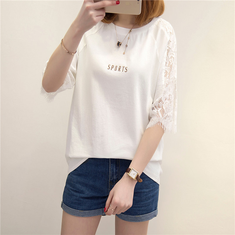 / 夏裝新款女上衣白色蕾絲t恤女中長袖鏤空打底體恤女短袖百搭
