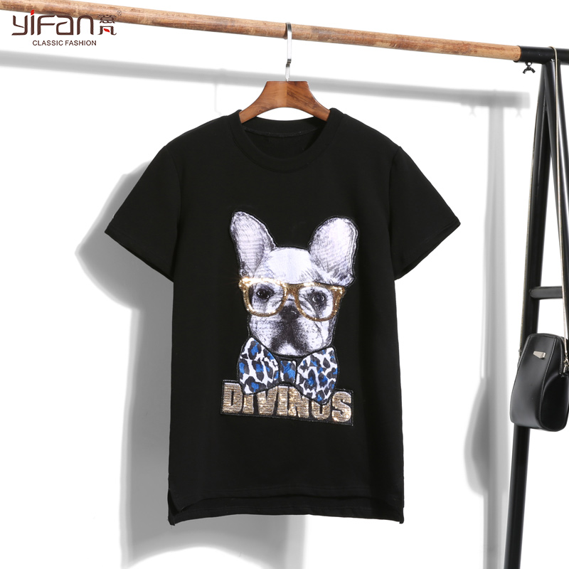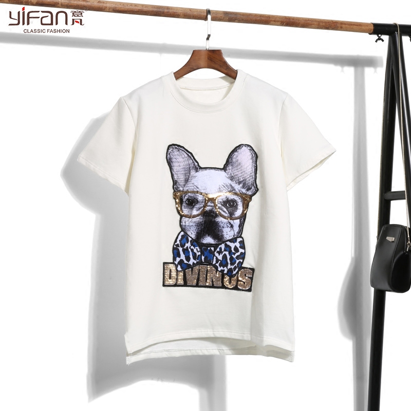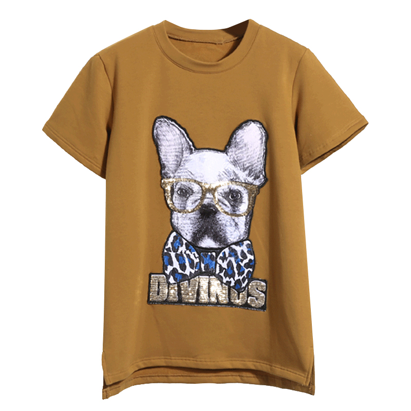 / 春裝寬松貼布亮片刺繡卡通狗短袖T恤韓版圓領套頭打底衫女裝