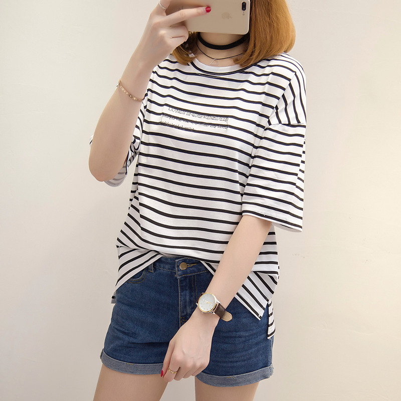 條紋t恤女韓版學生小清新上衣女夏bf風體恤衫短袖夏裝新款女