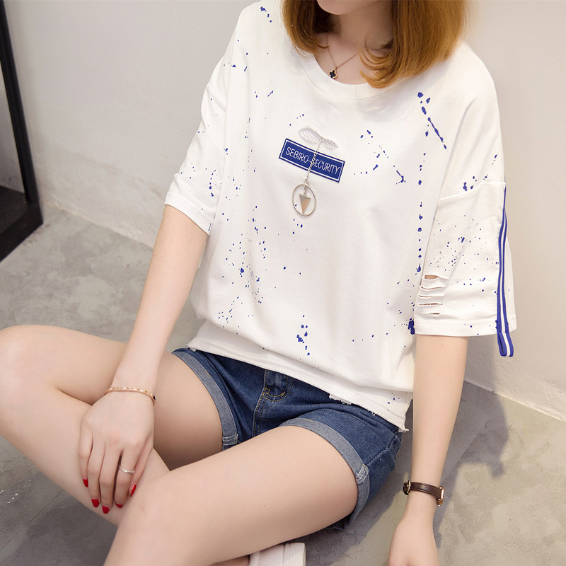 / 短袖上衣女夏裝新款破洞白色t恤女春季韓版打底百搭體恤衫潮