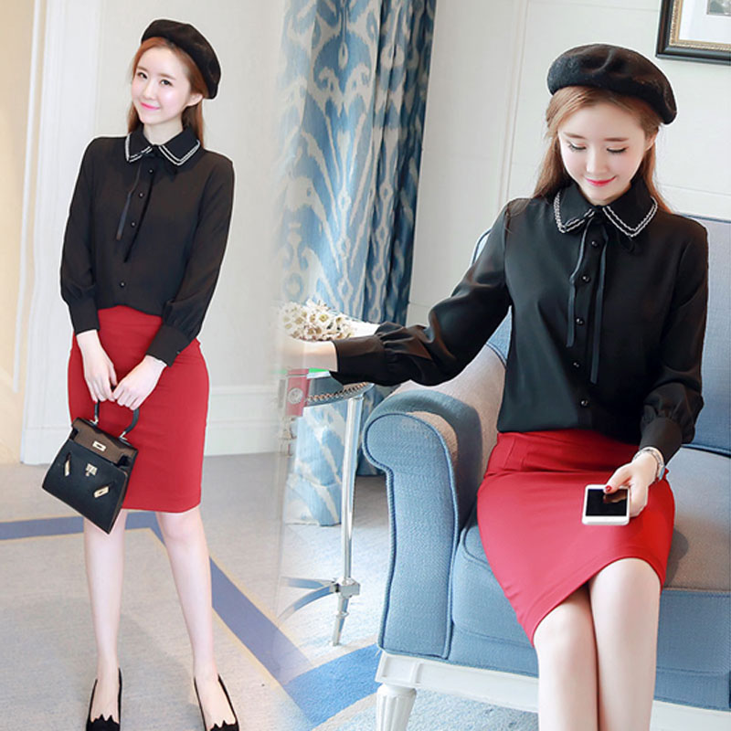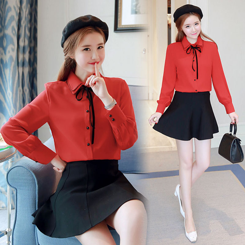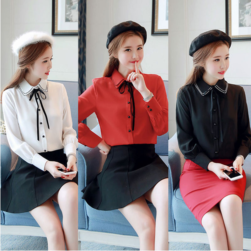 / 白襯衫女長袖春裝新款韓版百搭韓范立領蝴蝶結系帶雪紡襯衣女