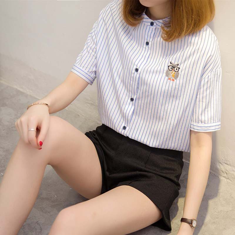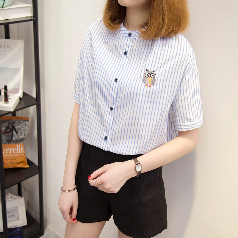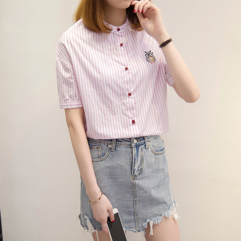/ 條紋襯衫女長袖小清新上衣女夏寬松半袖韓版bf風襯衣女百搭學生