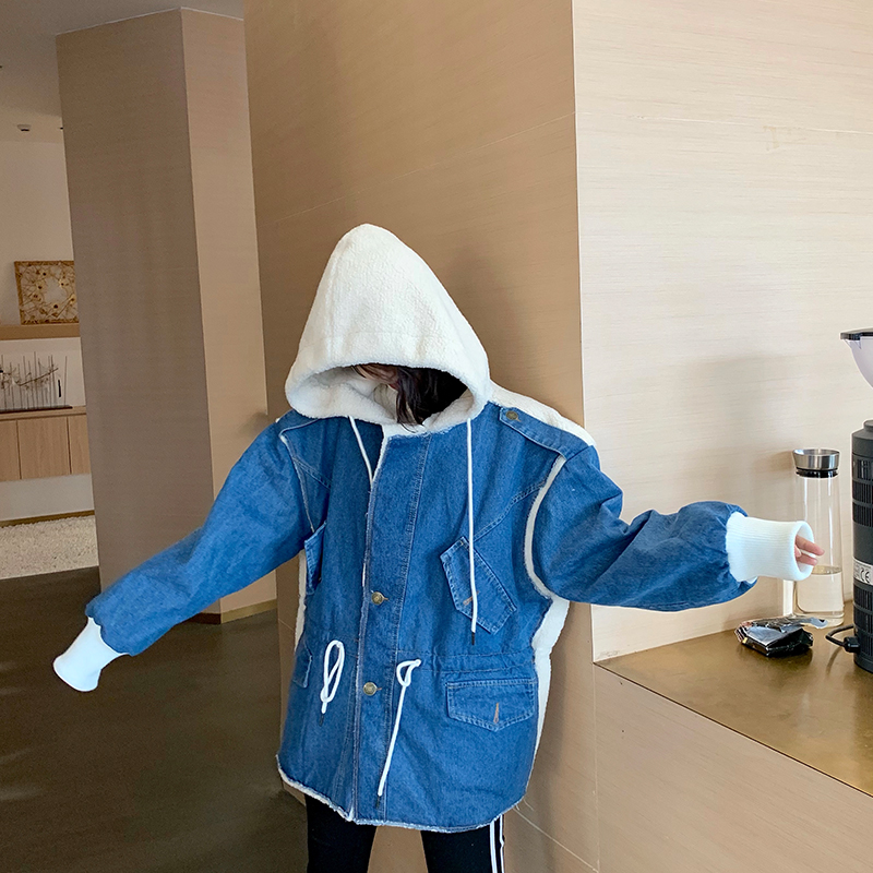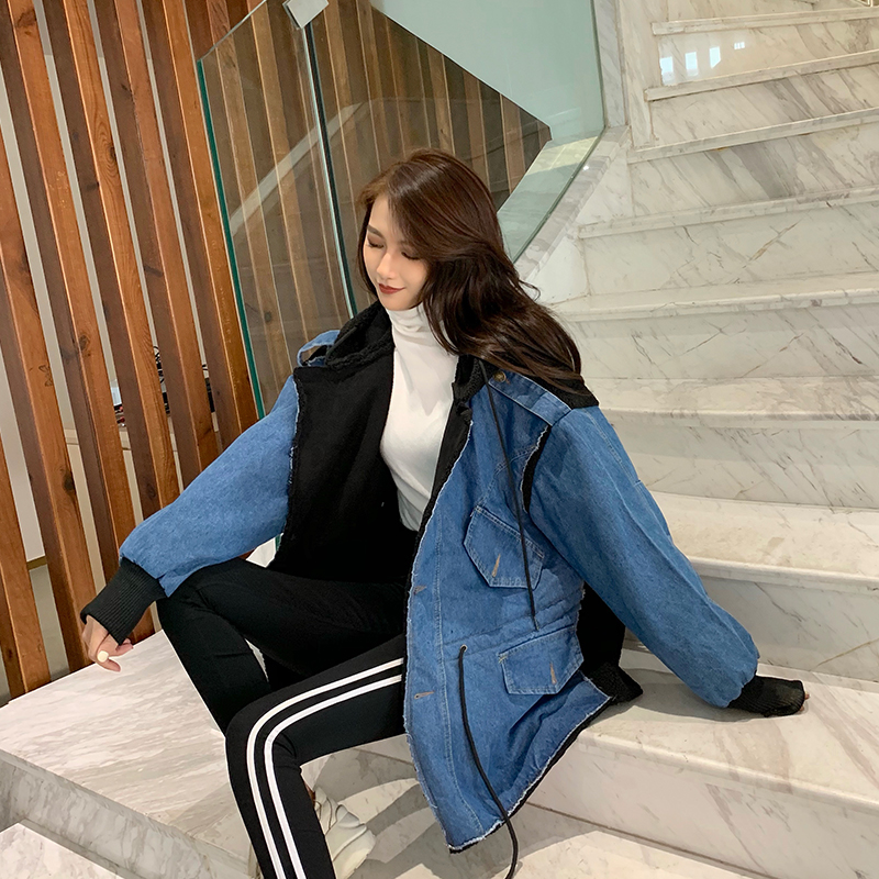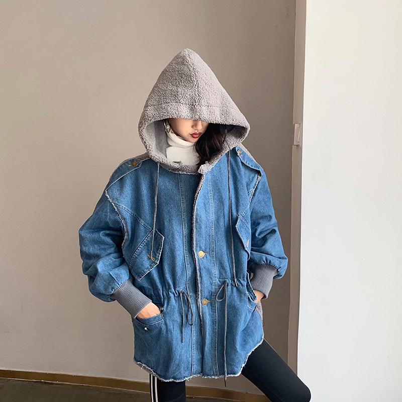 港味復古chic秋冬新款韓版加厚連帽設計感BF風時尚開衫女牛仔外套