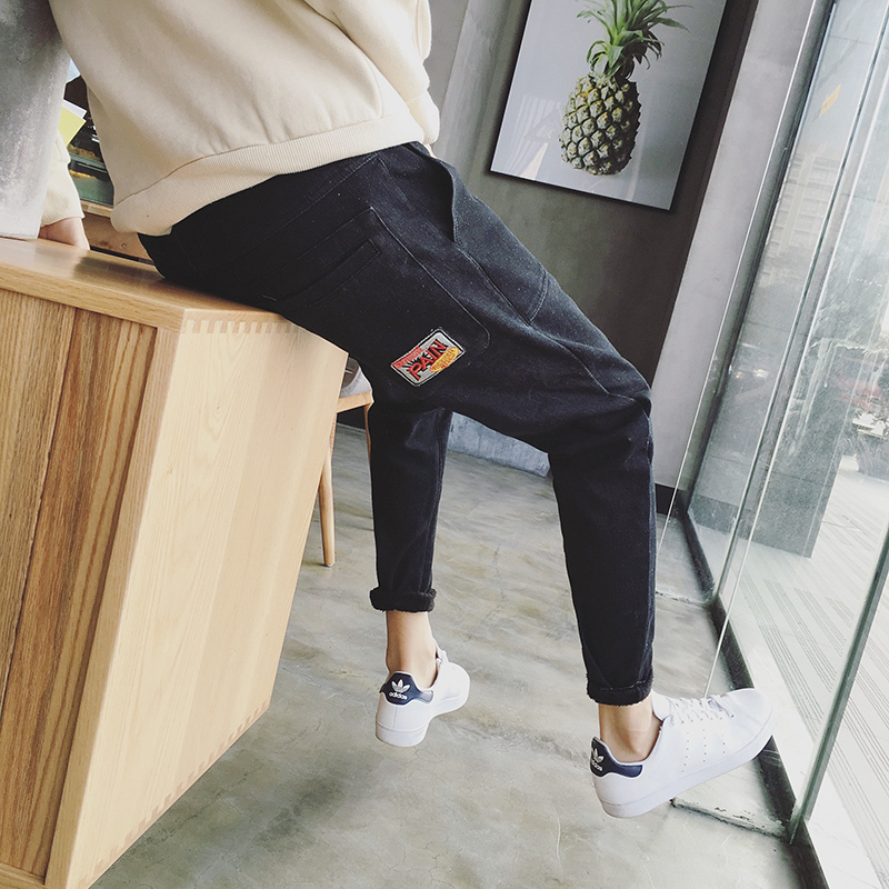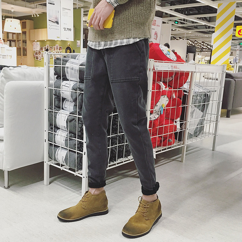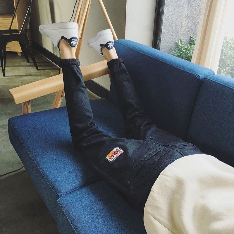 男裝后口袋貼布水洗韓版修身加厚小腳男士牛仔褲潮