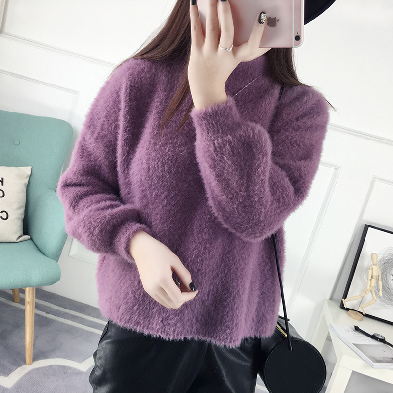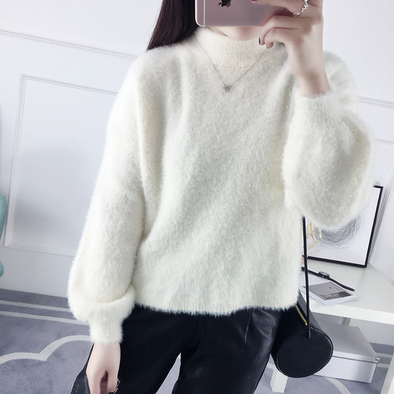 / 秋冬中高領針織打底衫純色寬松加厚套頭圓領毛衣女短款