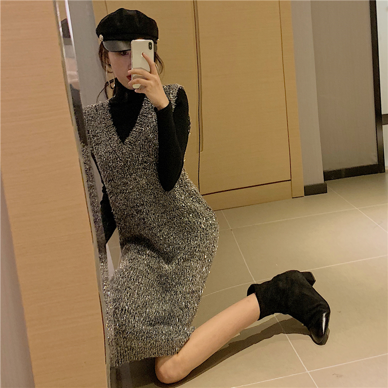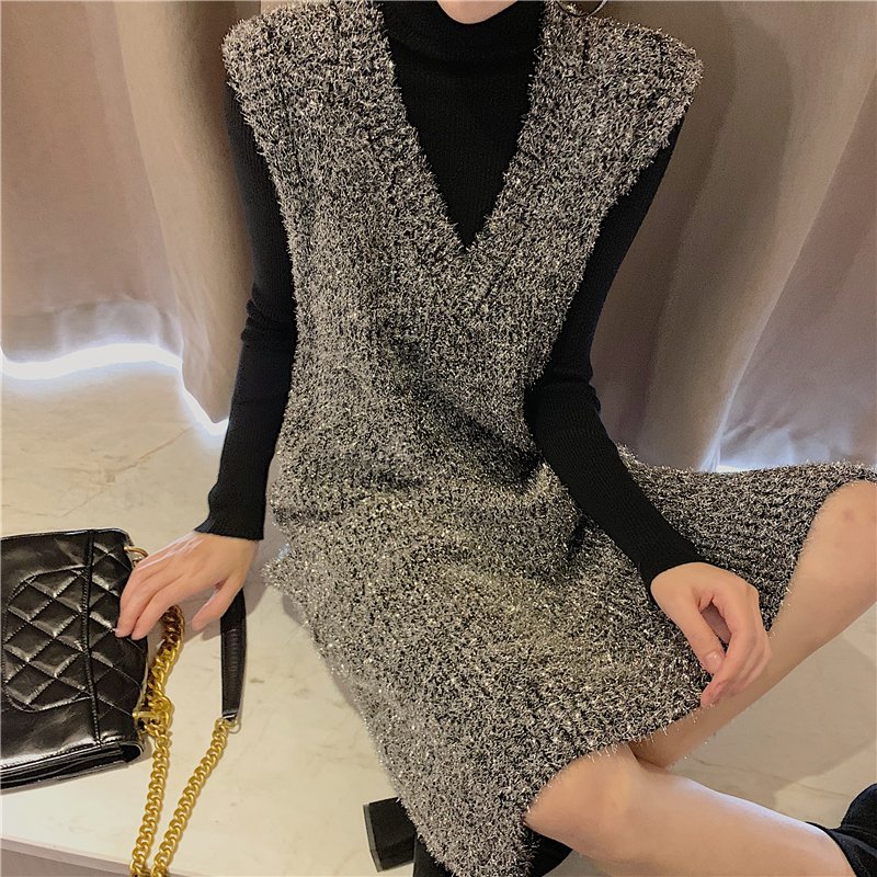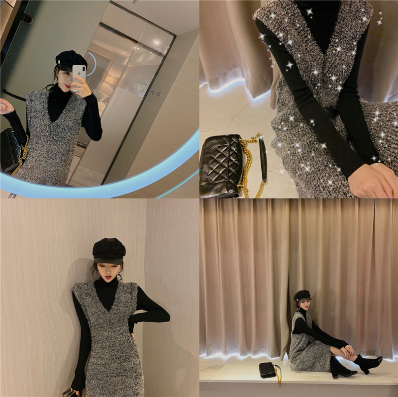 2018秋冬新款閃閃亮絲無袖V領套頭背心裙純色修身打底衫時尚套裝