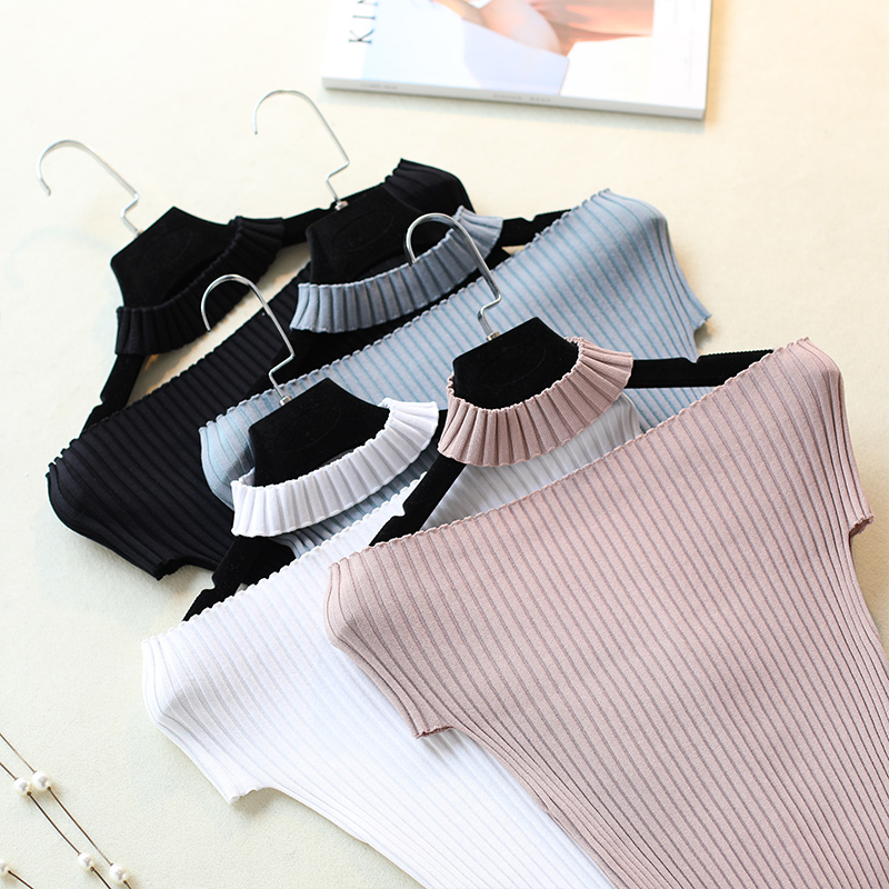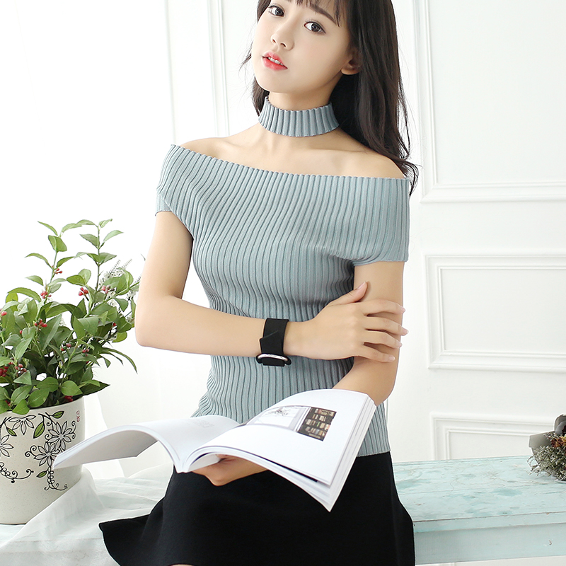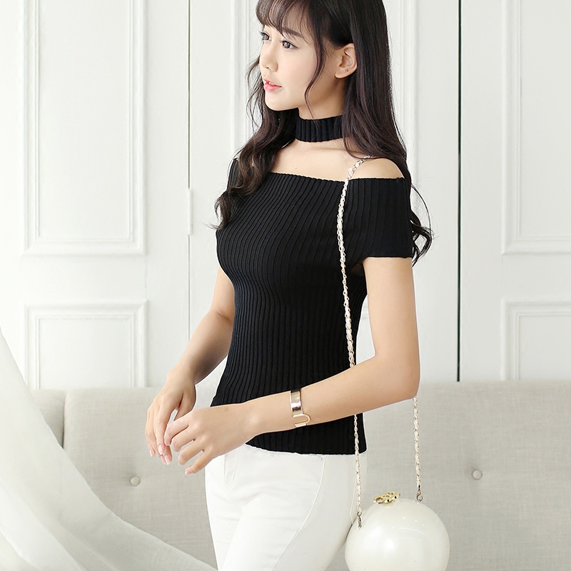 / 白色t恤女短袖夏修身露肩針織打底衫女短款純色百搭薄款體恤上衣
