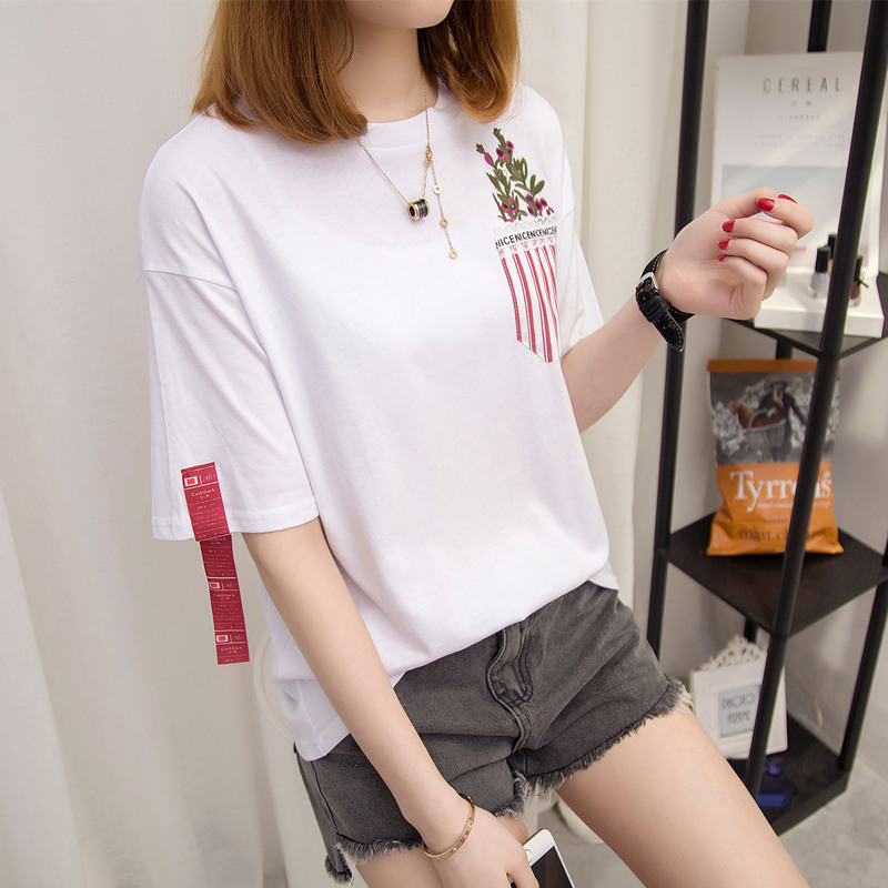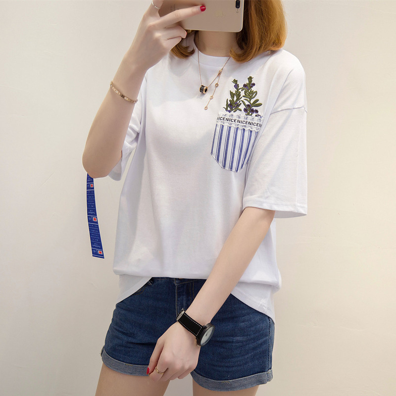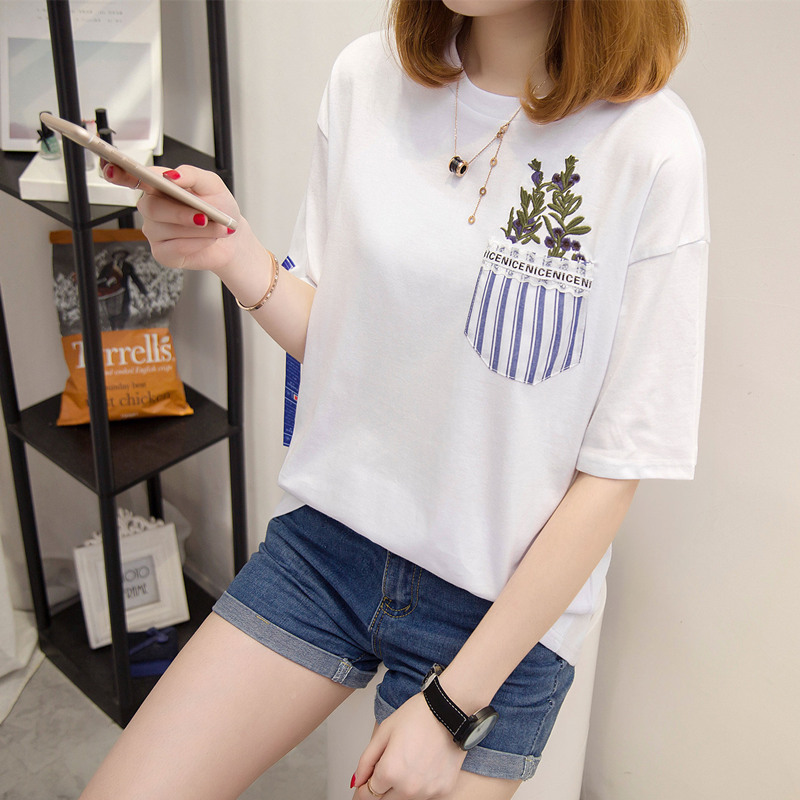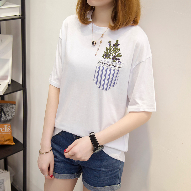 白色t恤女韓版條紋休閑寬松短袖體恤衫上衣女夏裝新款女裝潮