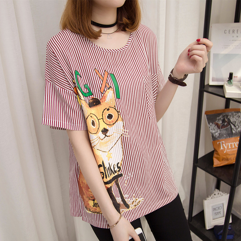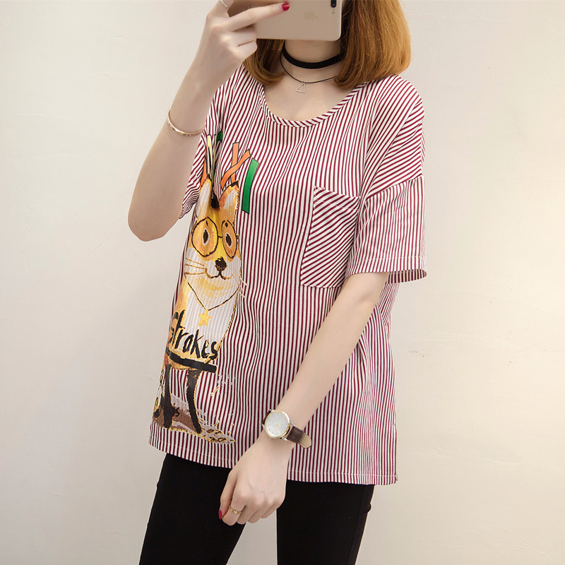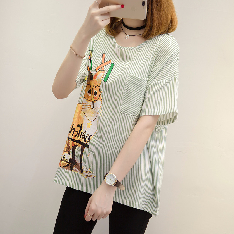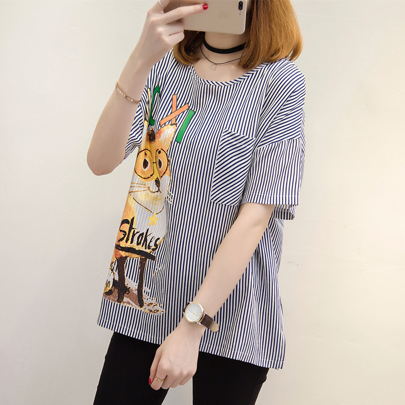 夏裝新款女條紋T恤女小清新上衣女夏韓版卡通bf風體恤衫短袖