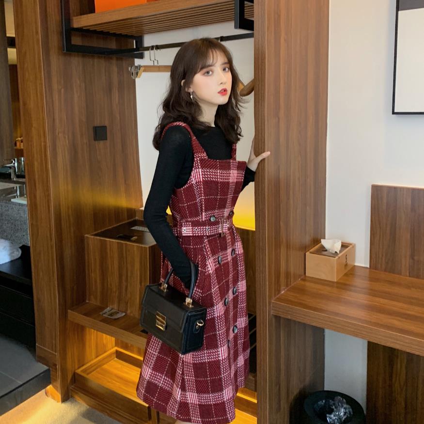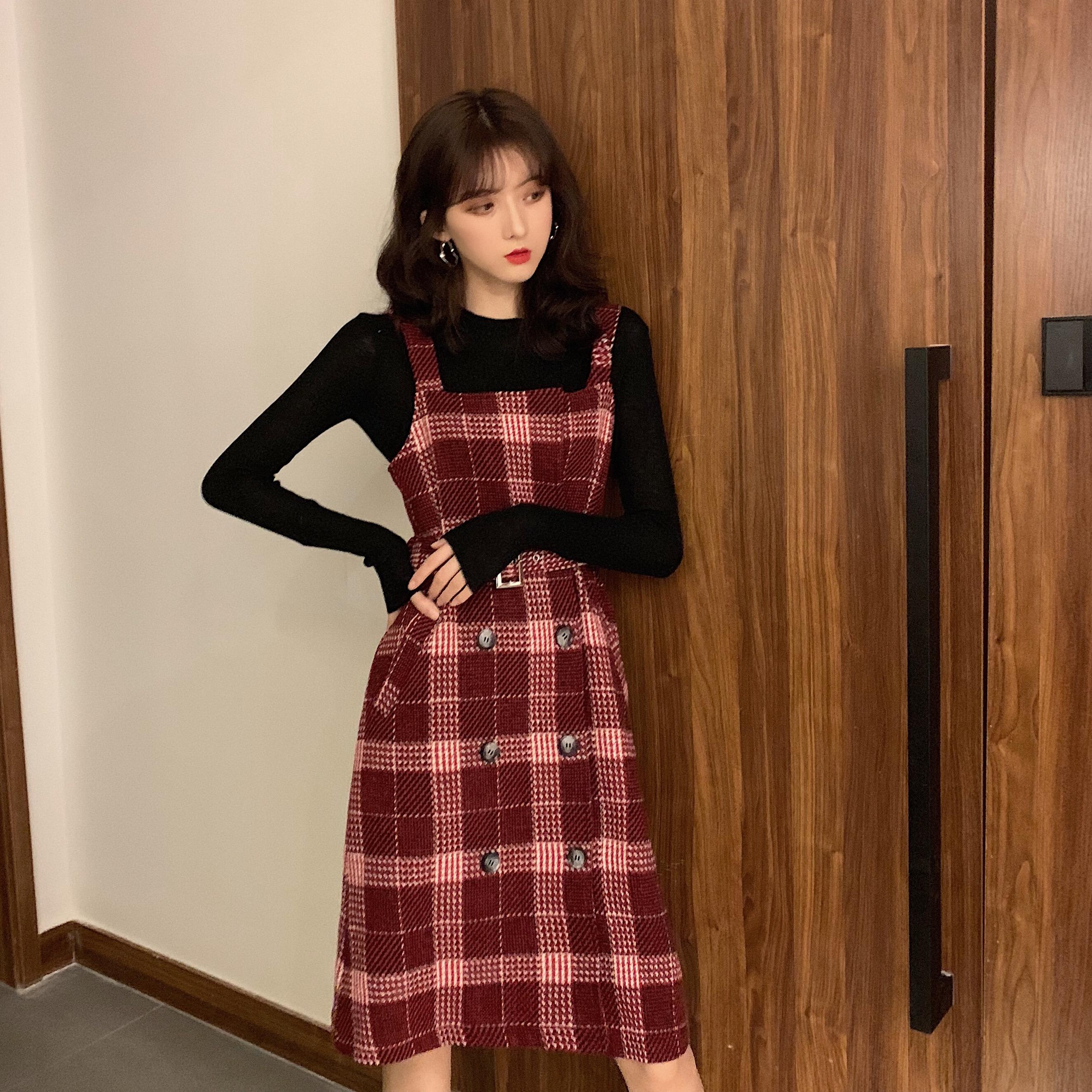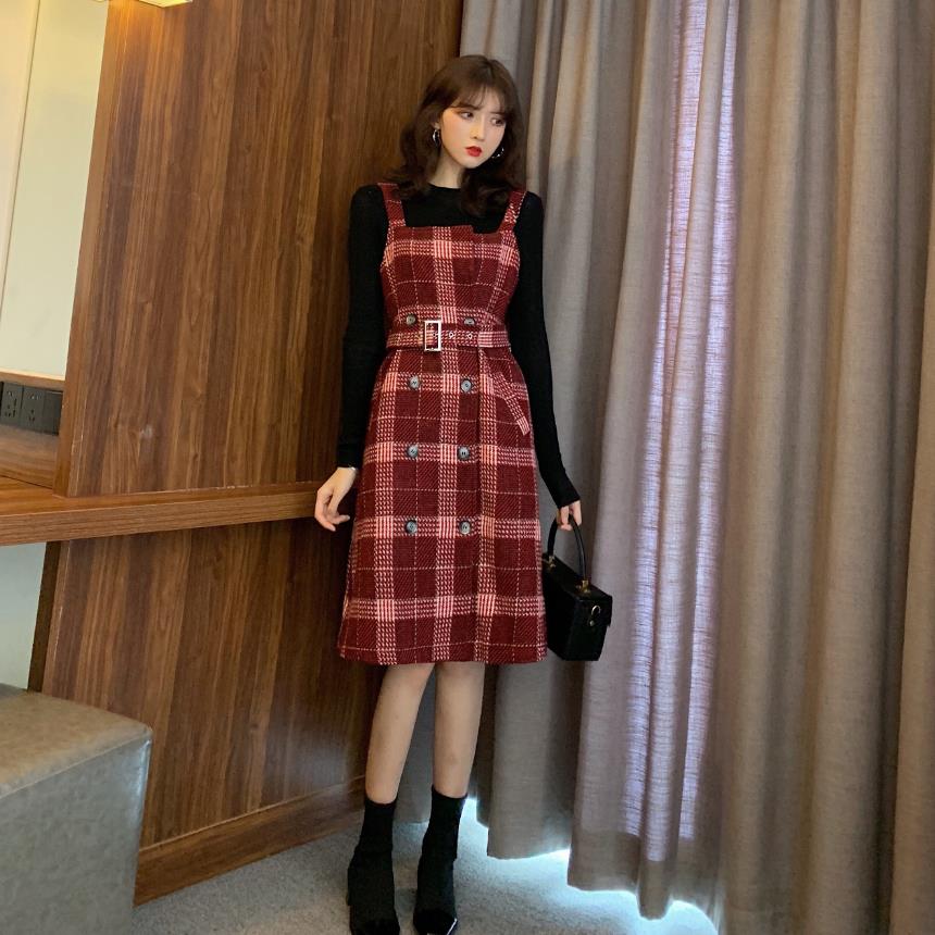 / 格子拼接短款外套修身百搭打底衫收腰背心呢子連衣裙時尚三件套潮