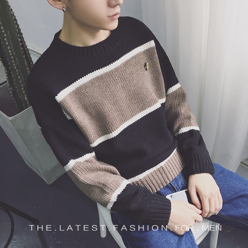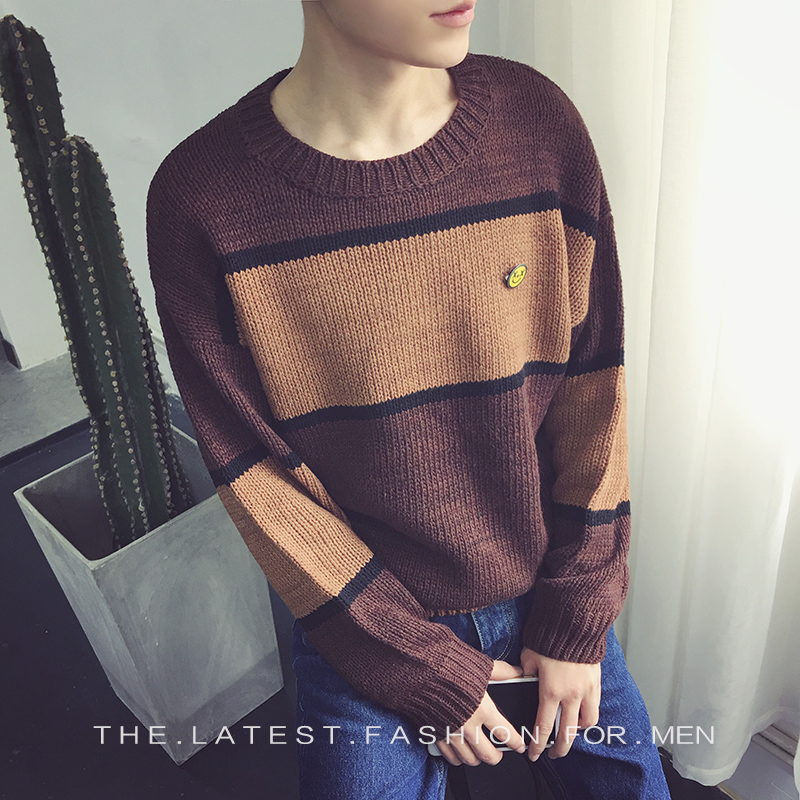 / 男裝新品撞色笑臉提花圓領修身套頭男士針織衫毛衣