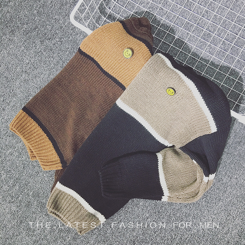 男裝新品撞色笑臉提花圓領修身套頭男士針織衫毛衣