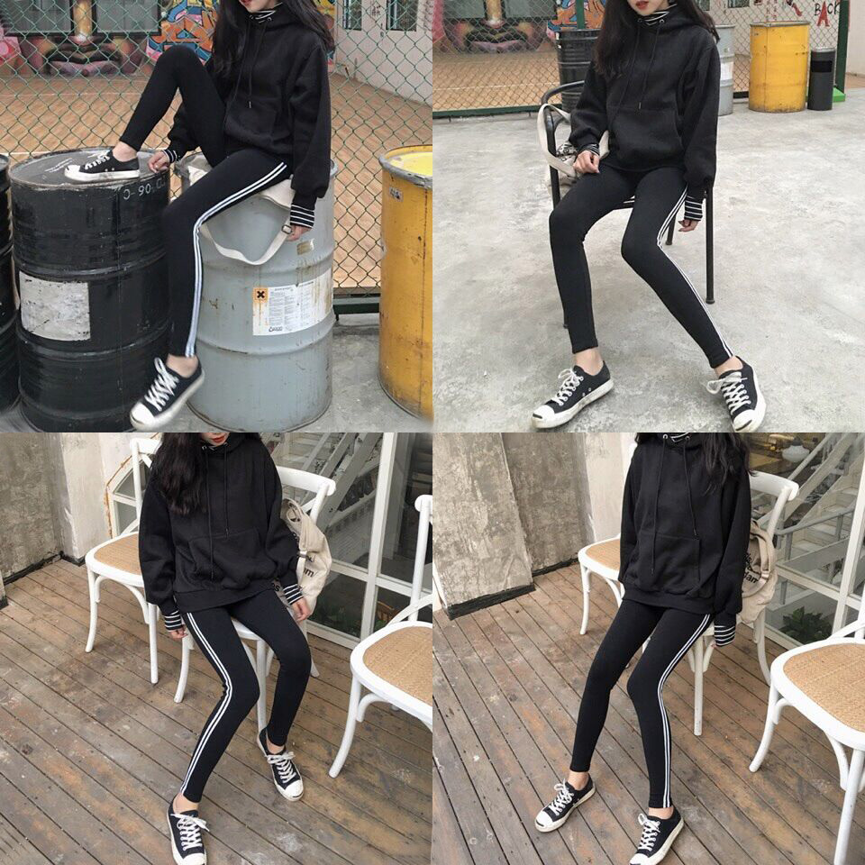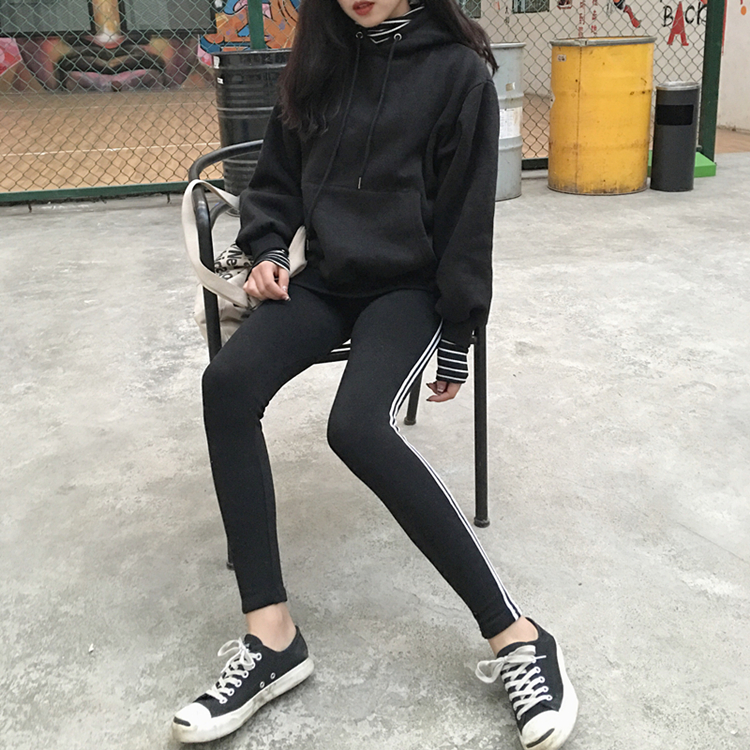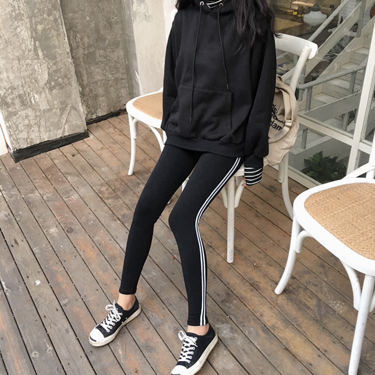 / 韓國chic秋冬款雙扛條彈力松緊腰打底褲外穿黑色小腳褲長褲女