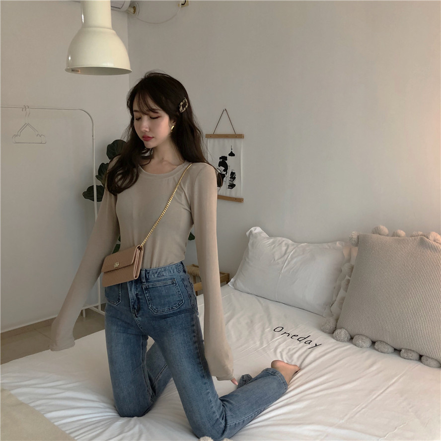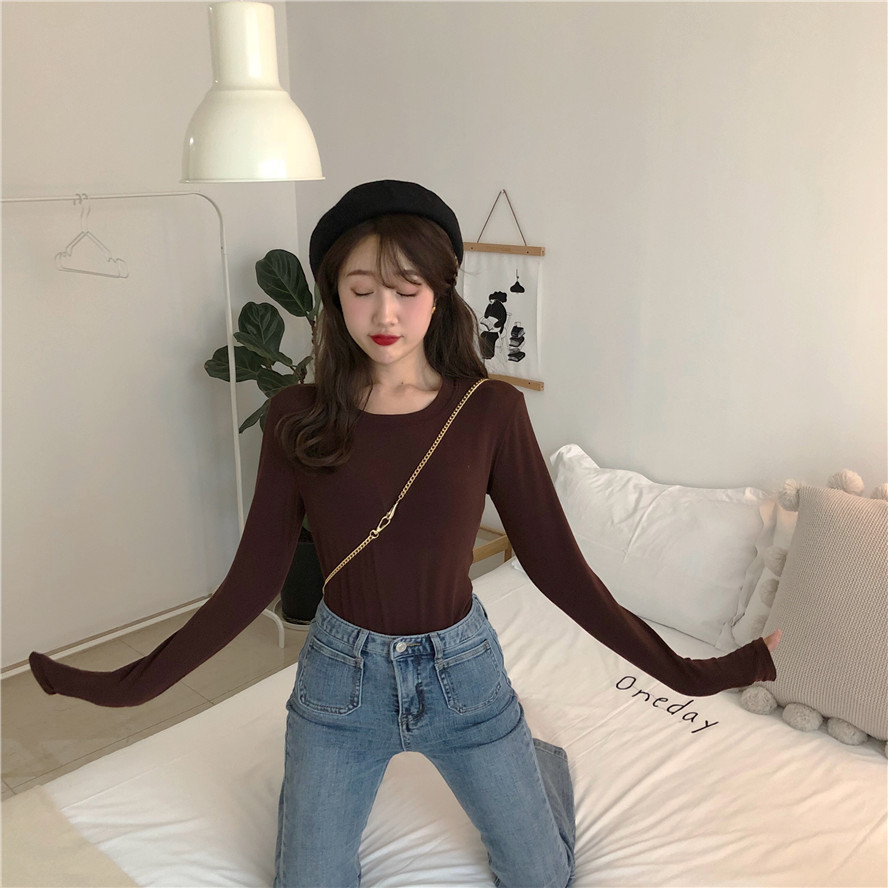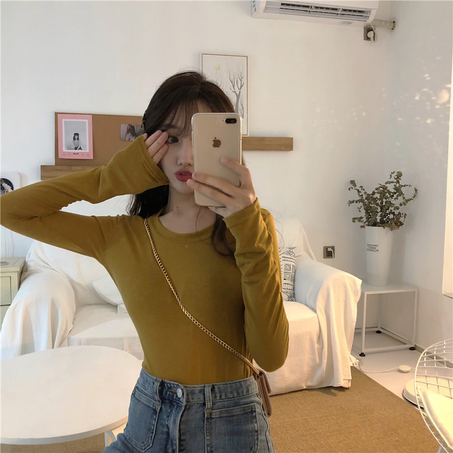 / 打底衫女秋冬新款chic復古簡約基礎色百搭修身長袖圓領T恤上衣潮