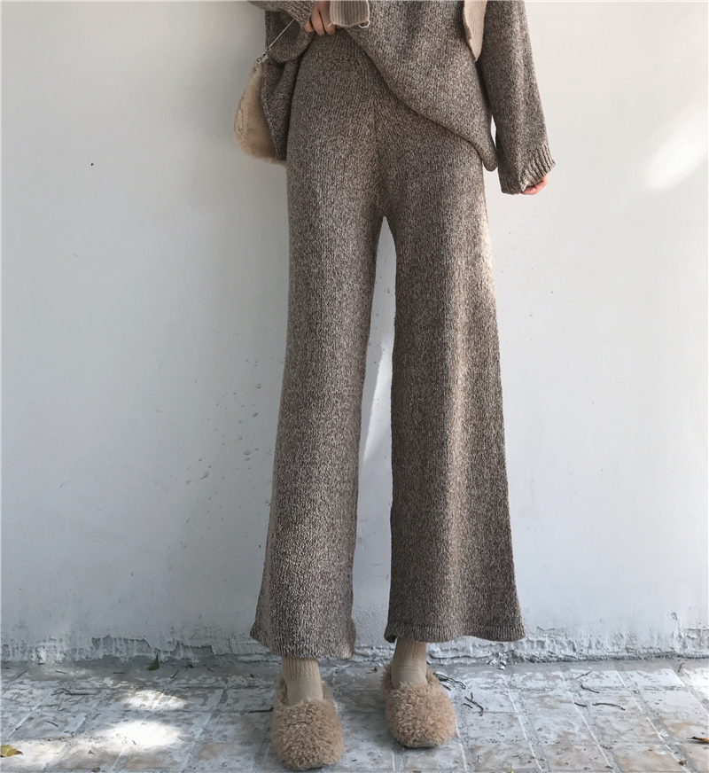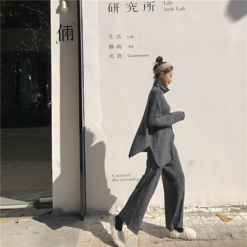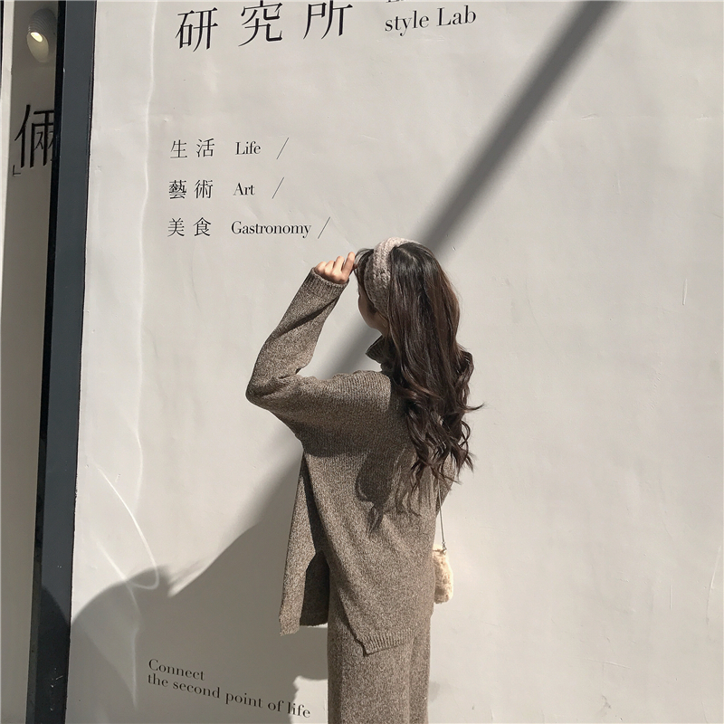 復古慵懶寬松加厚保暖高領毛衣高腰顯瘦針織闊腿褲時尚套裝兩件套