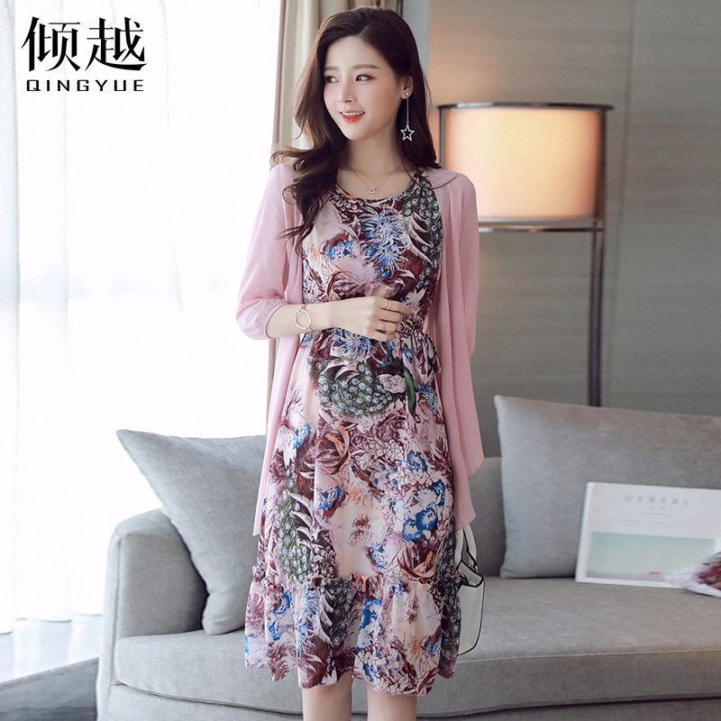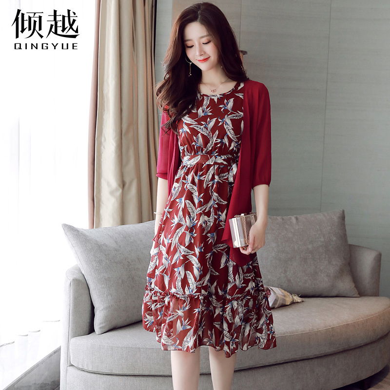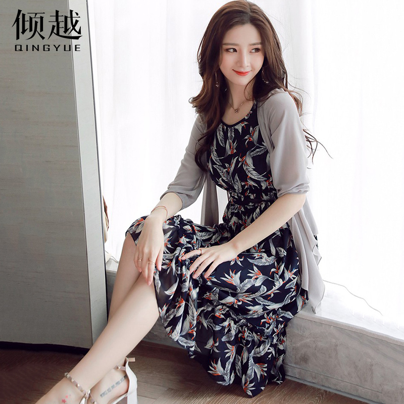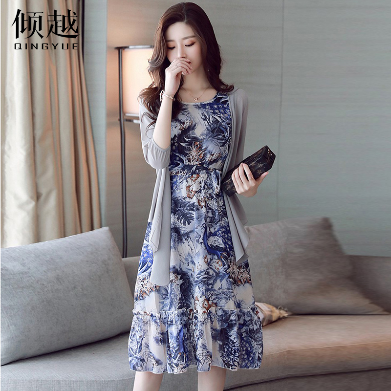 傾越雪紡連衣裙女2017春秋新款女裝顯瘦時尚套裝裙中長裙兩件套夏