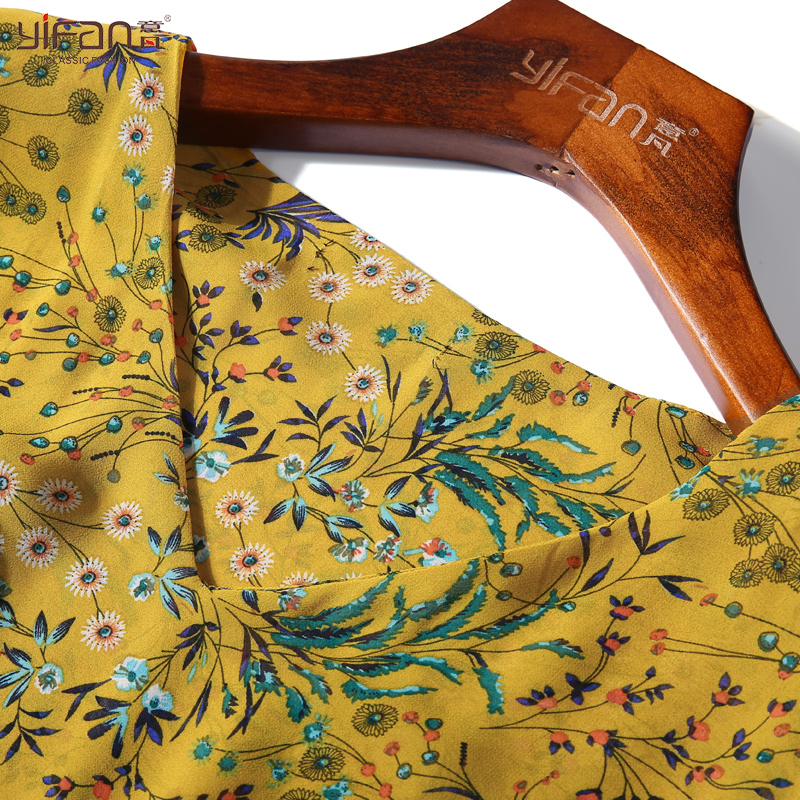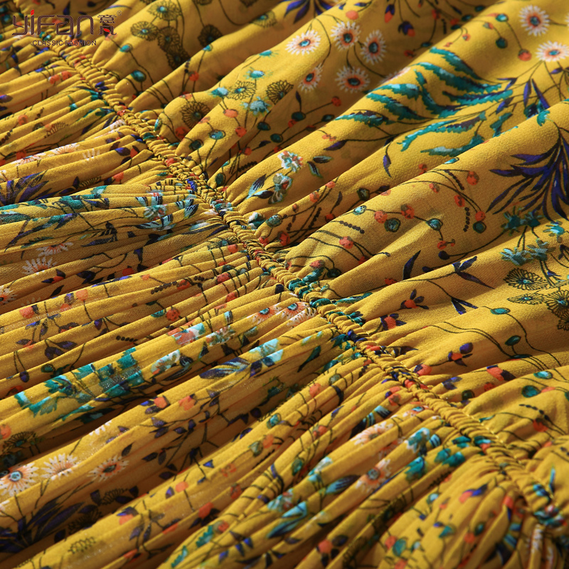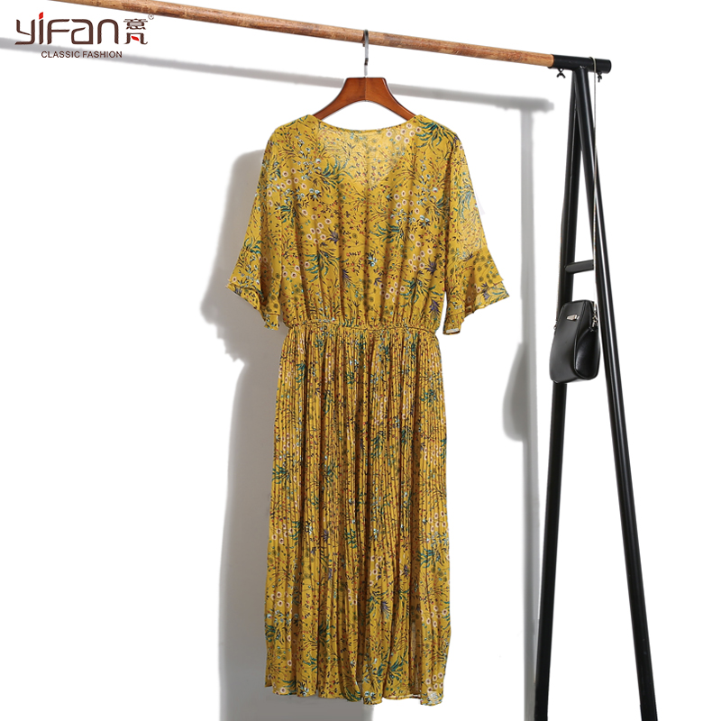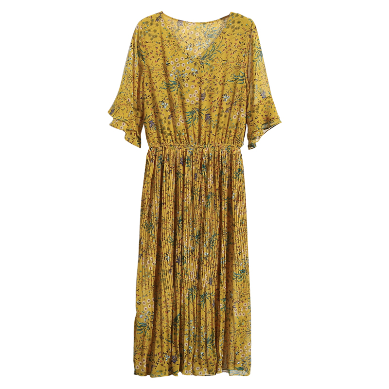 / 夏季韓版雪紡碎花連衣裙女氣質顯瘦百褶裙v領喇叭袖沙灘長裙