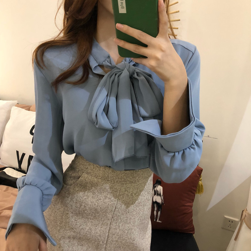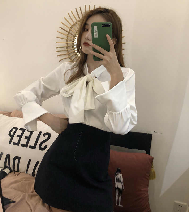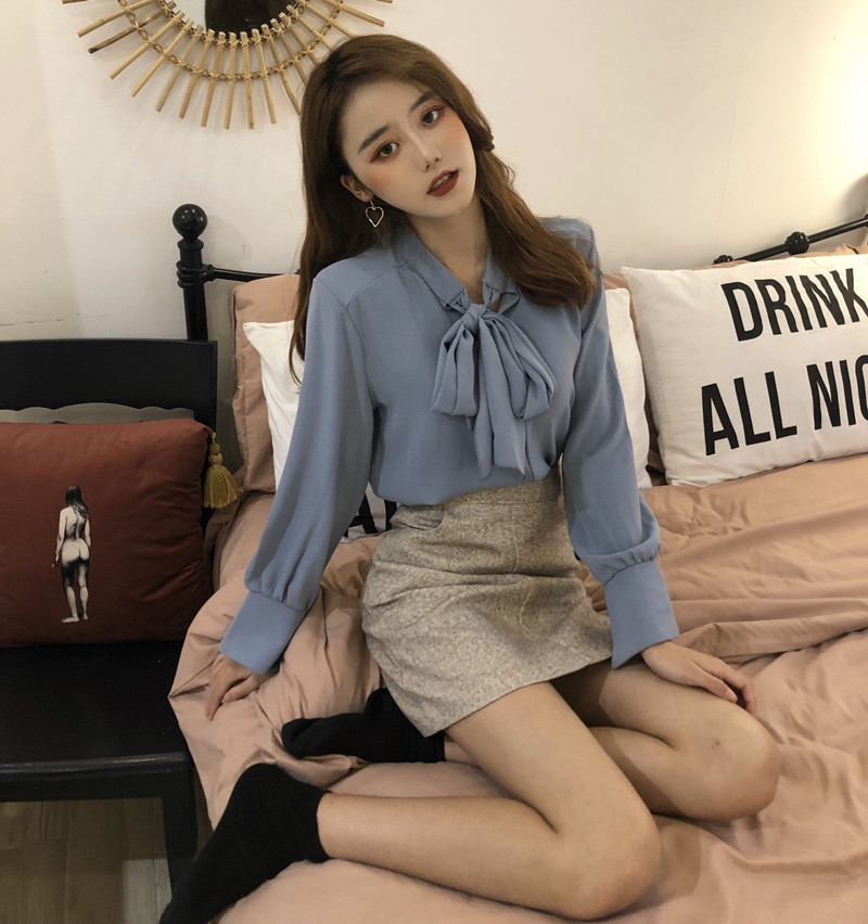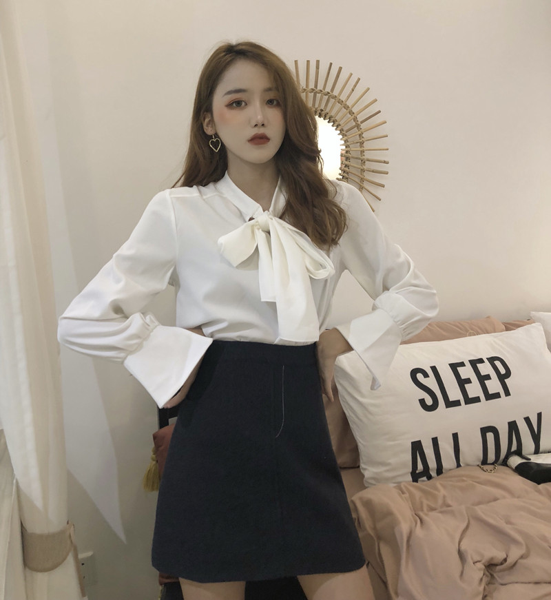 新款韓版秋季蝴蝶結V領寬松上衣長袖雪紡襯衫半身裙港風時尚套裝