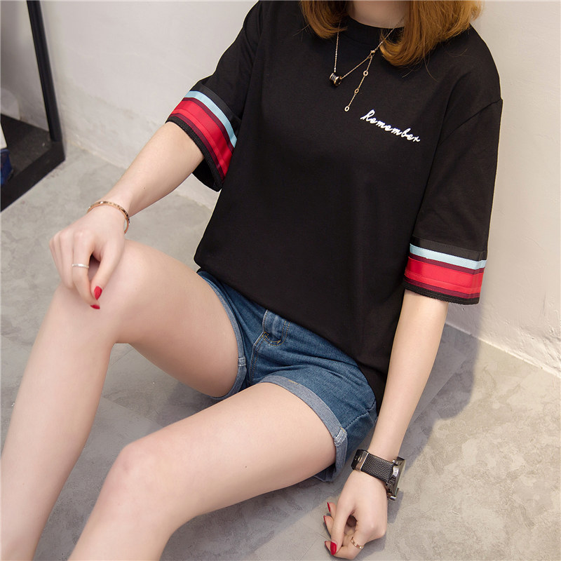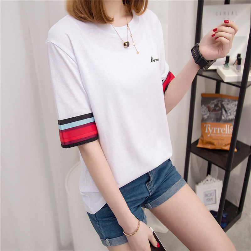 / 短袖上衣女夏新款條紋白色t恤女拼色短袖韓版字母打底衫百搭