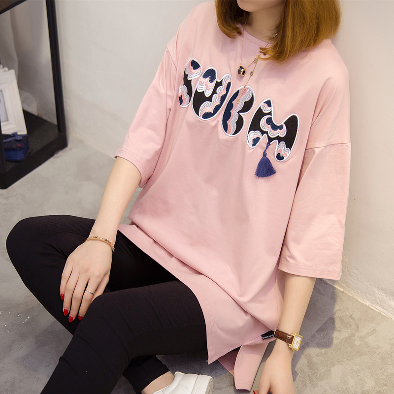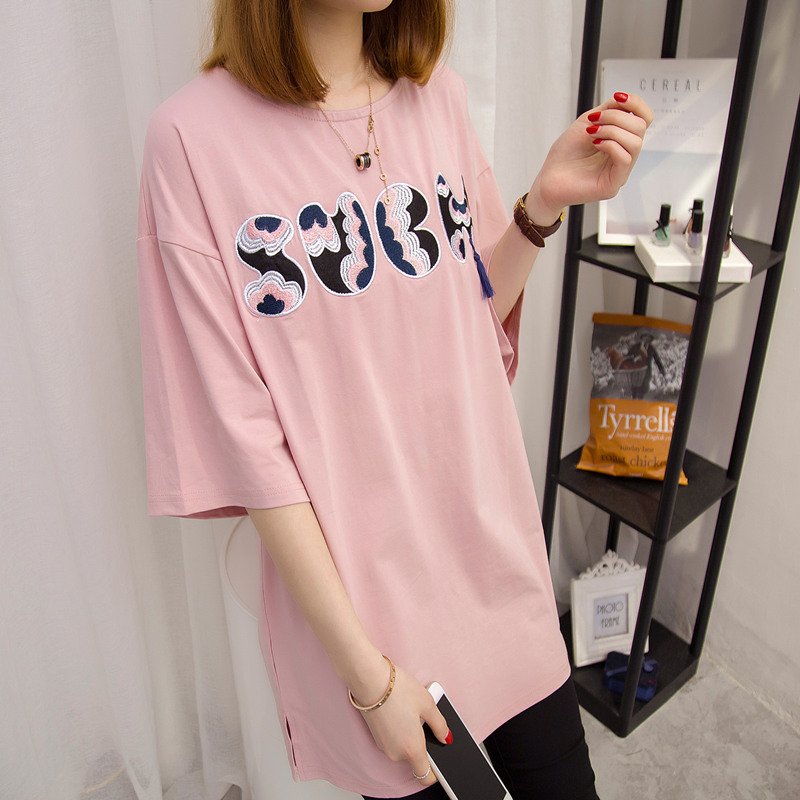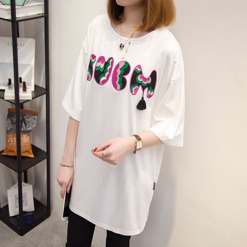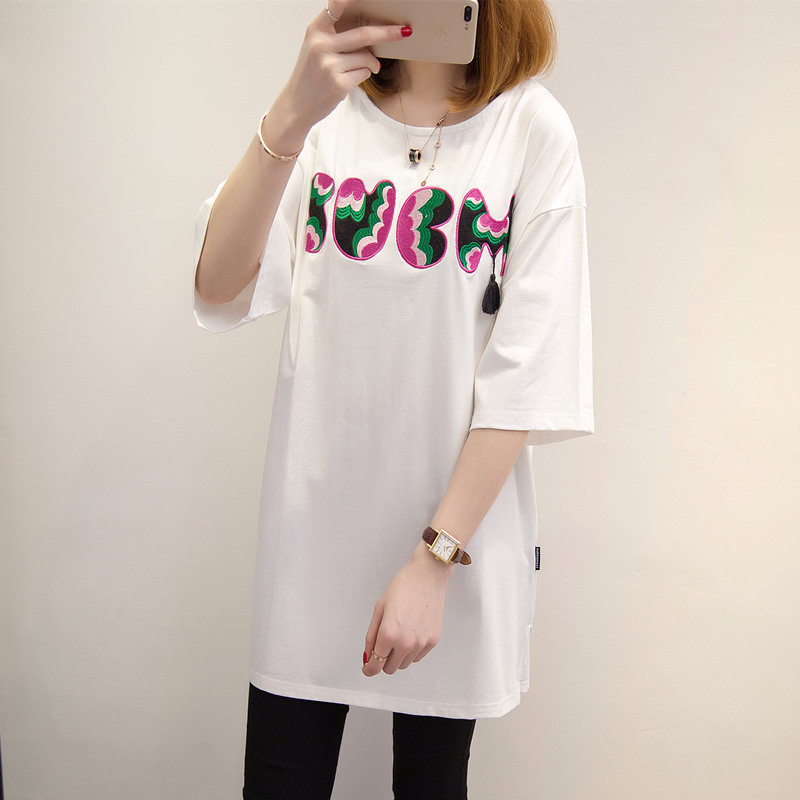 短袖上衣女夏新款寬松白色t恤女中長袖刺繡韓版打底體恤百搭