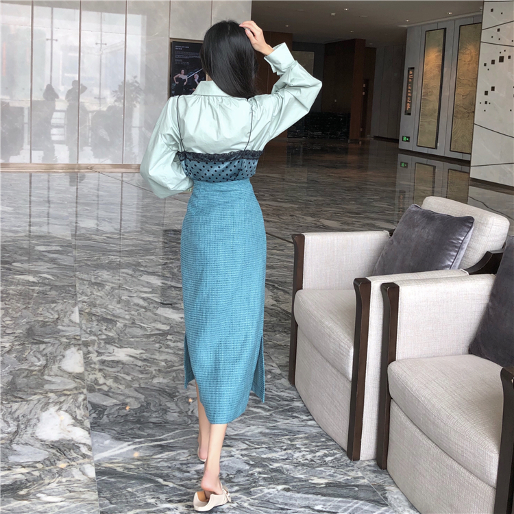 綠襯衣+吊帶|綠色半身裙