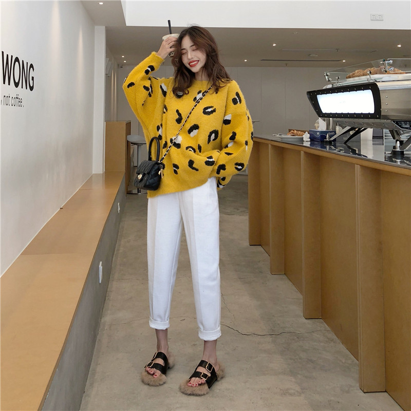 圓領豹寬松慵懶風紋毛毛斑點針織衫高腰直筒蘿卜毛呢褲時尚套裝女