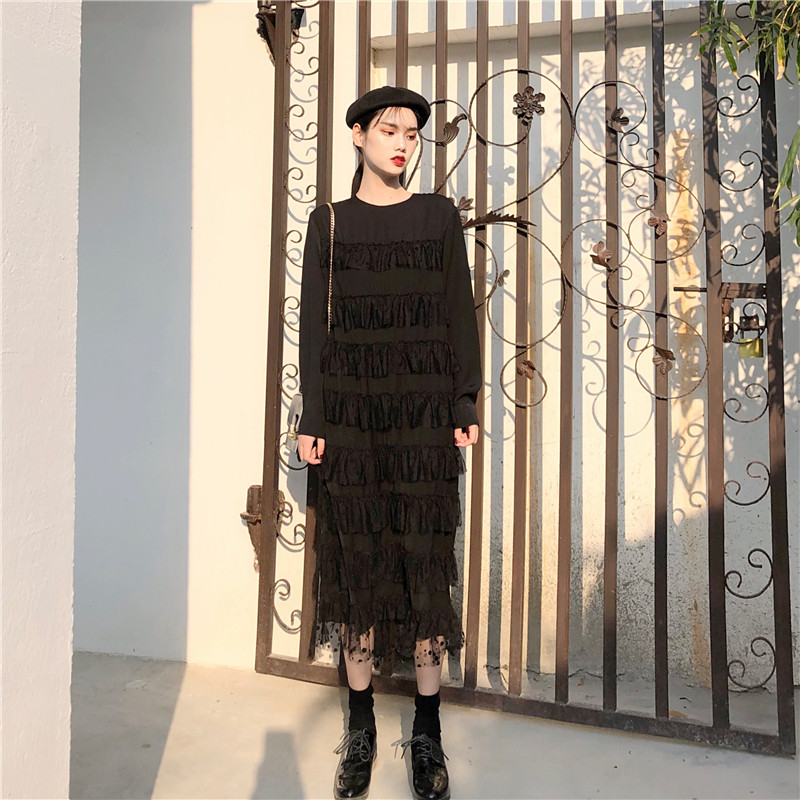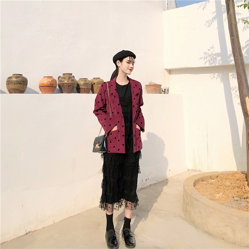 / 韓國復古風長款波點蕾絲蛋糕連衣裙修身顯瘦西服外套港風時尚套裝