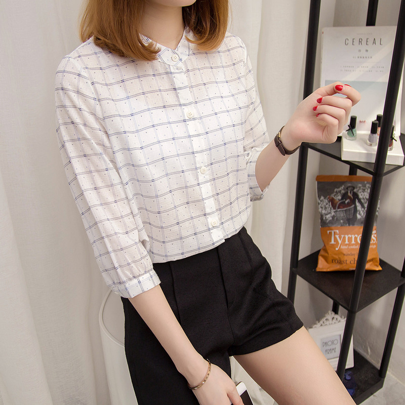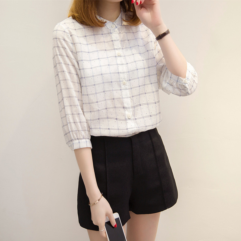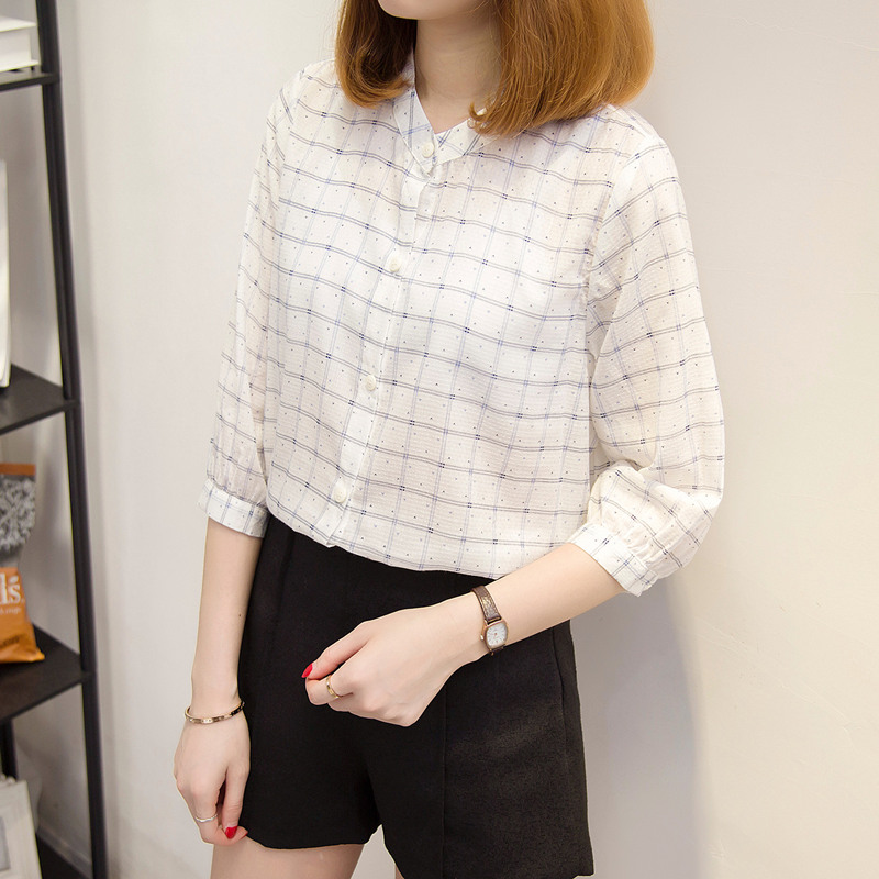 / 條紋小清新格子襯衫女半袖韓范白色短袖襯衣寬松上衣女夏新款